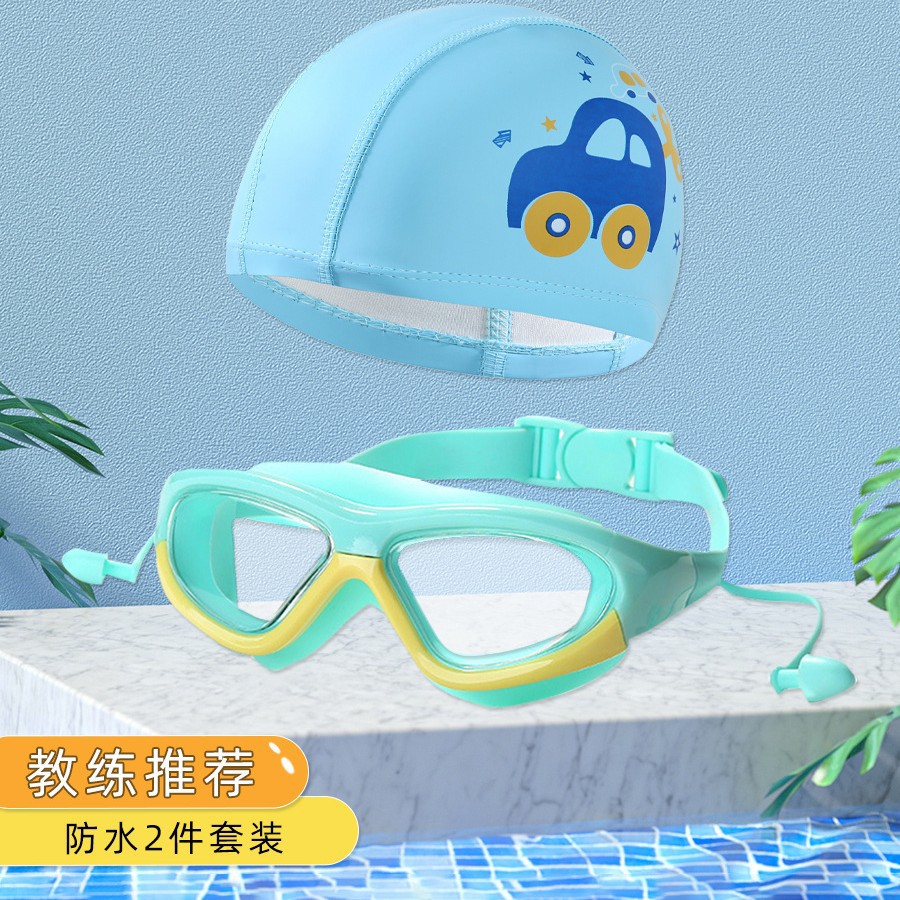 boxed green and yellow swimming goggles + swimming cap (2-piece set)