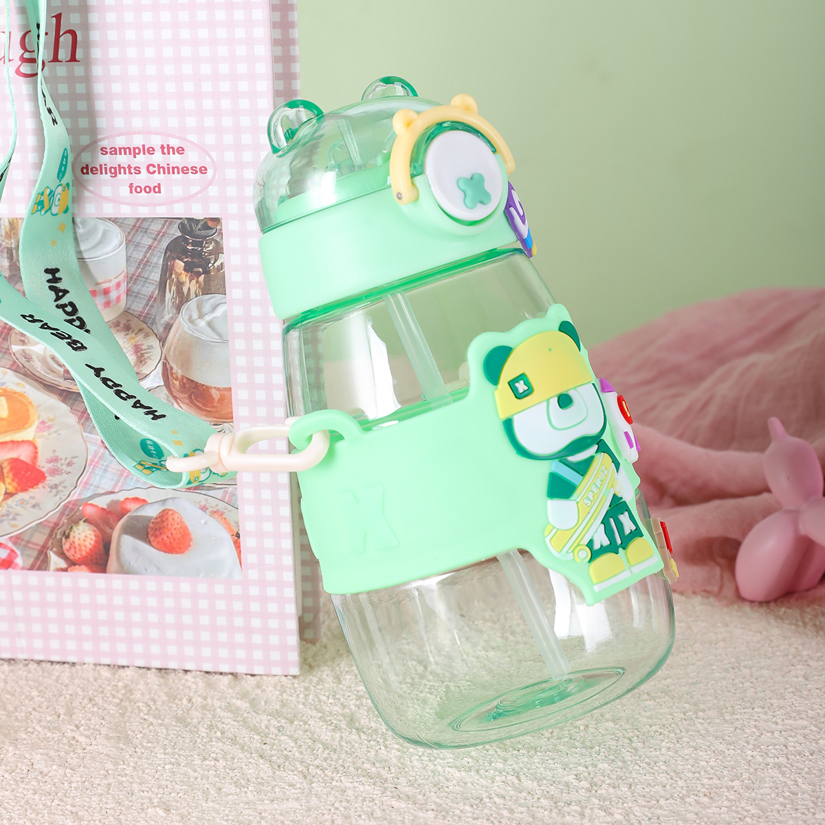 summer drag bear child's plastic water cup good-looking straw bullet cup strap high temperature resistant anti-fall water cup