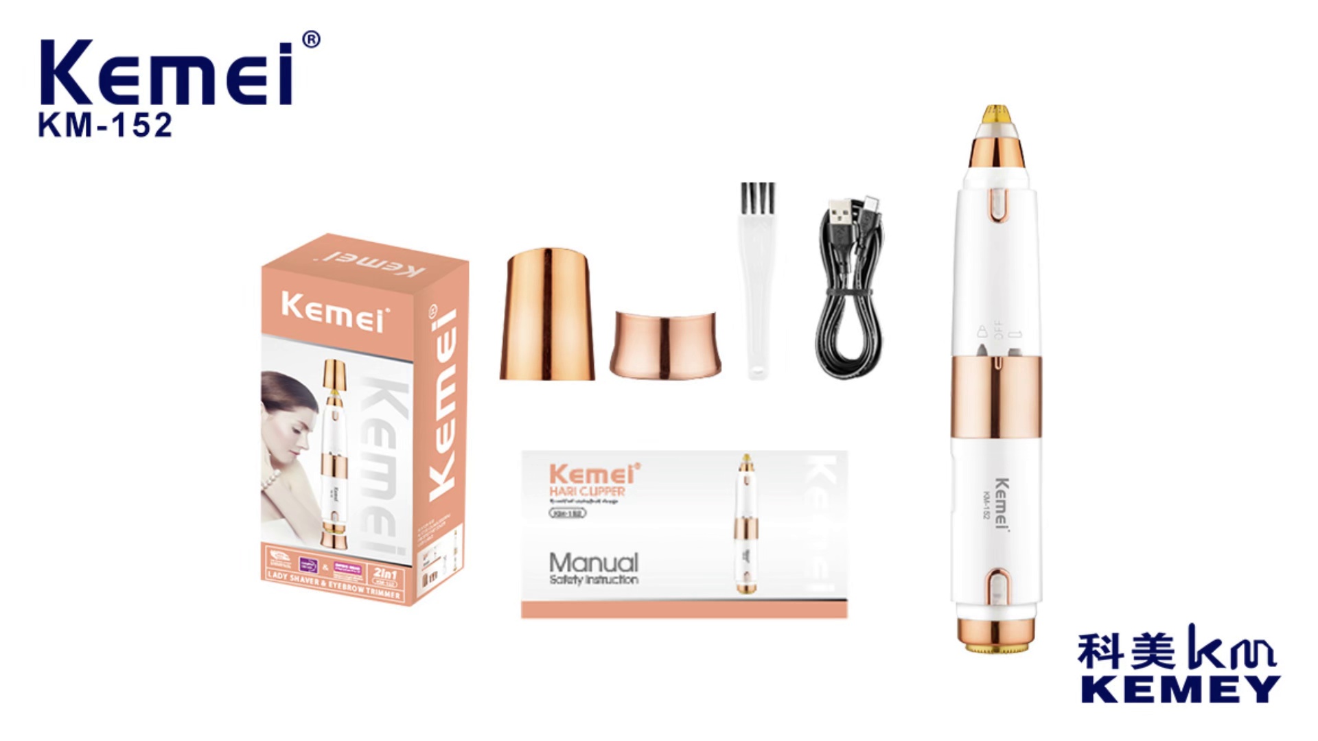 kemei km-152 usb charging women's shaver 2-in-1 mini-portable cutter head detachable design