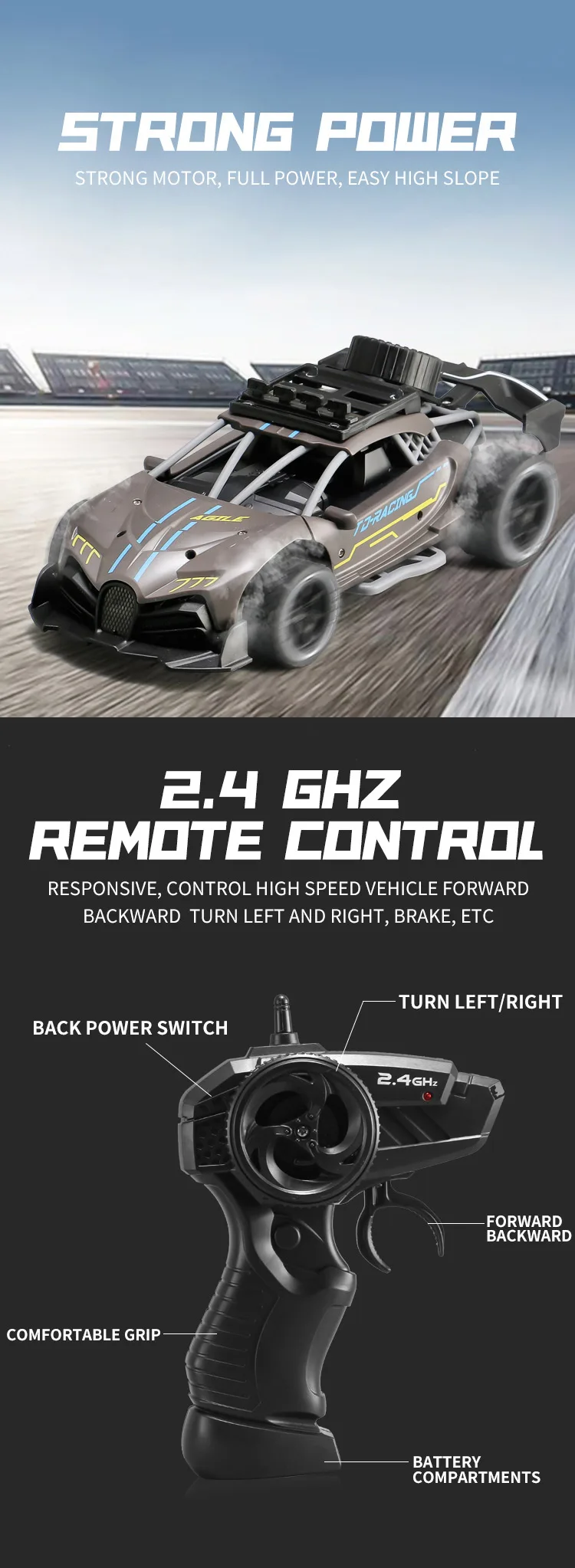 Product features: | Remote control ,High speed car, Cool shape,Cool lights. |