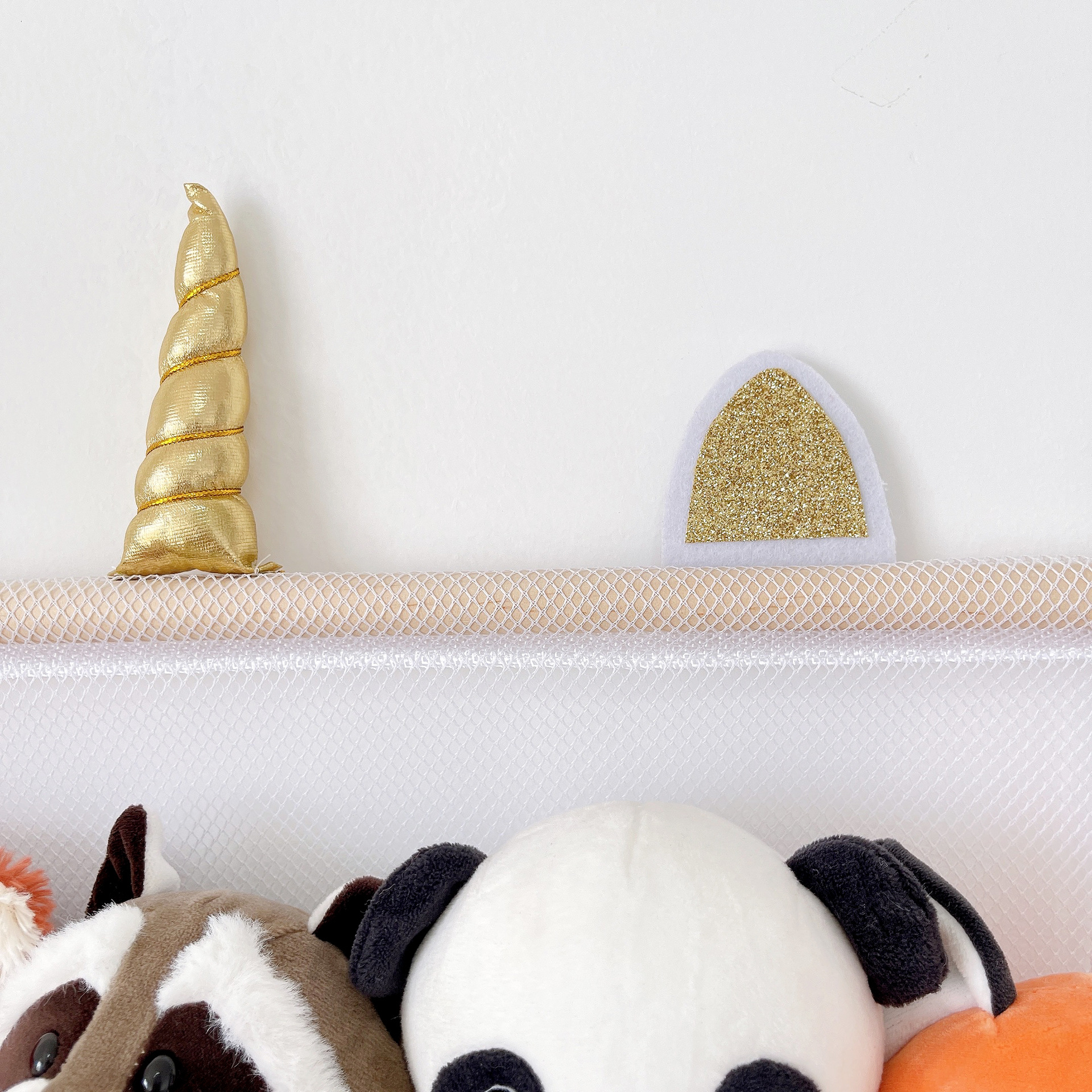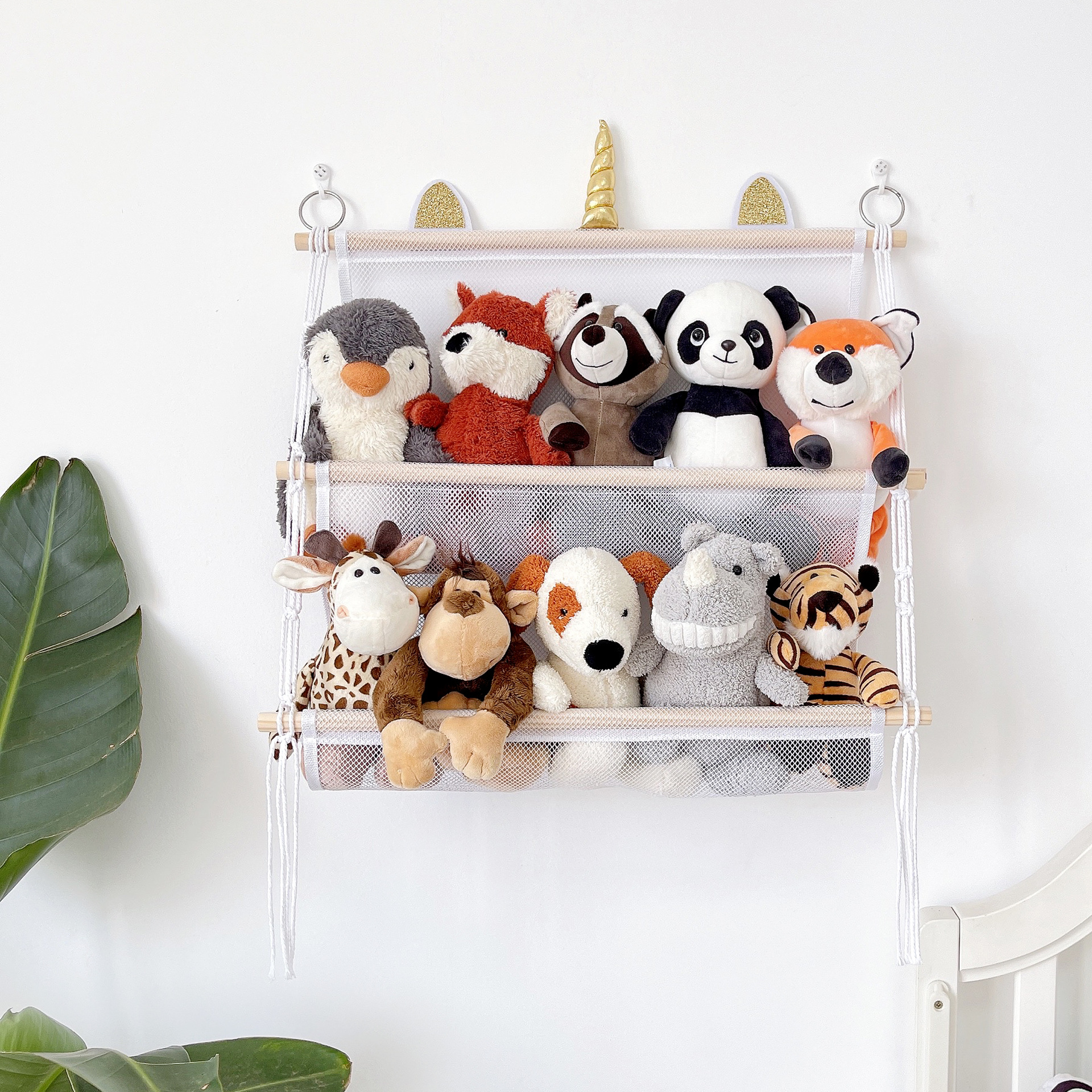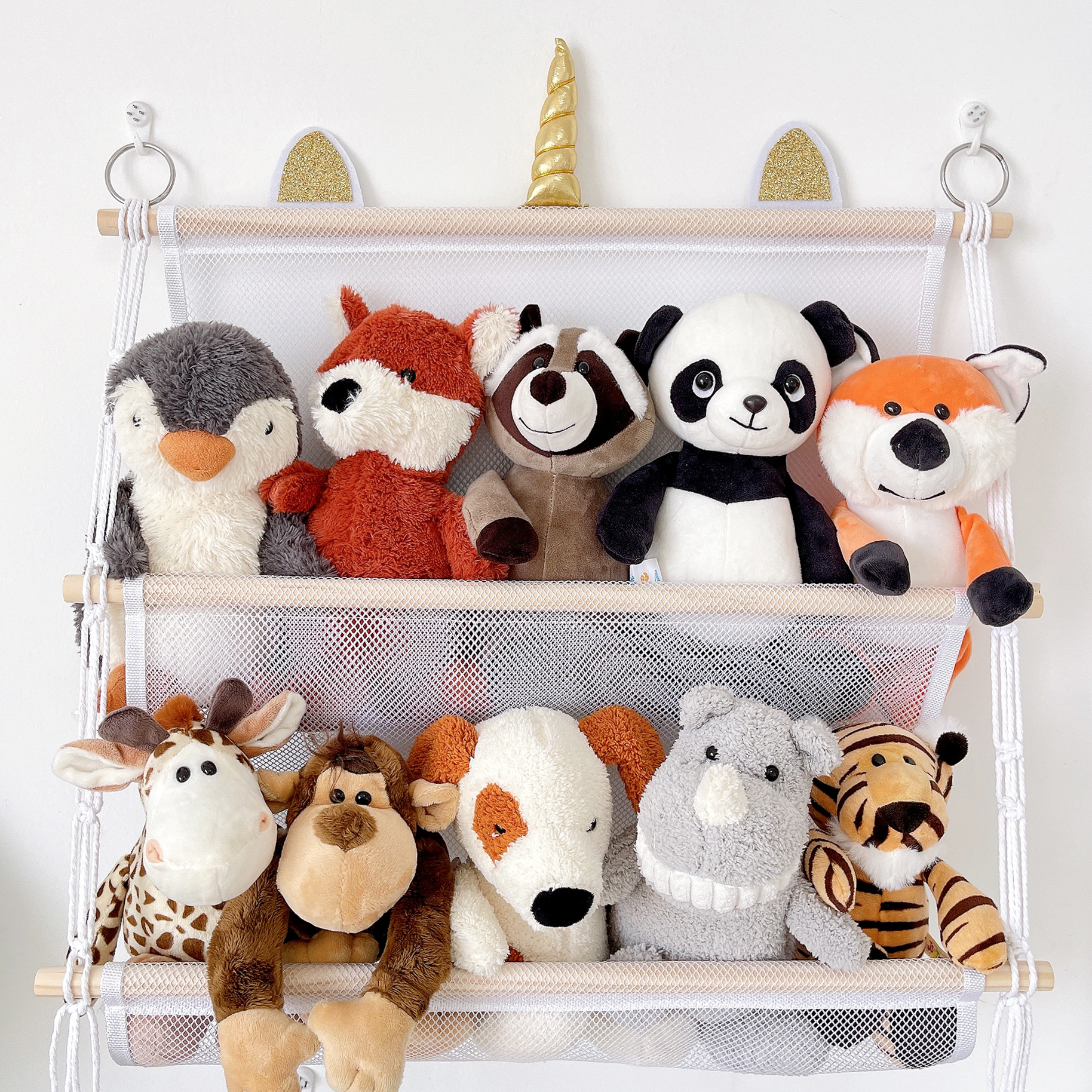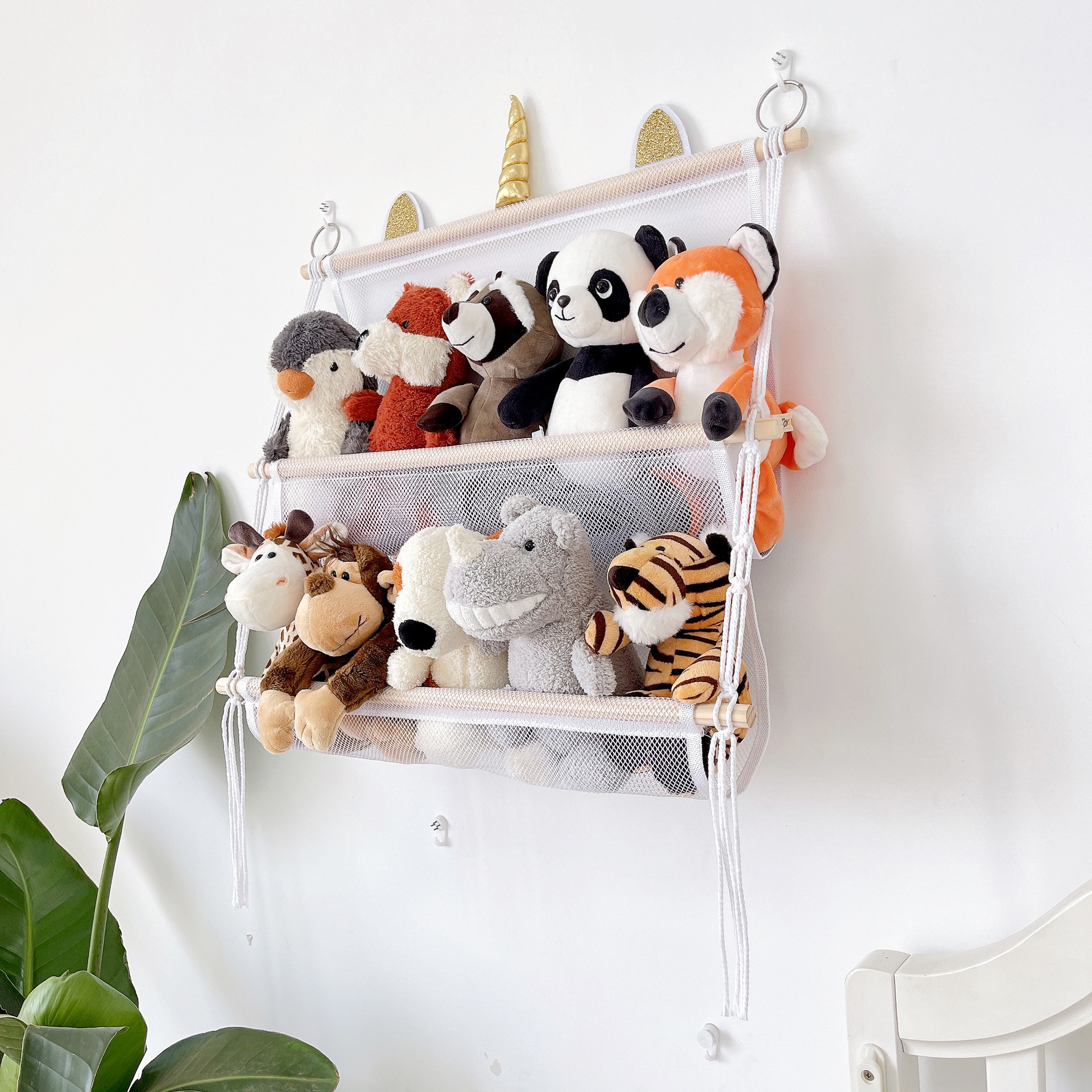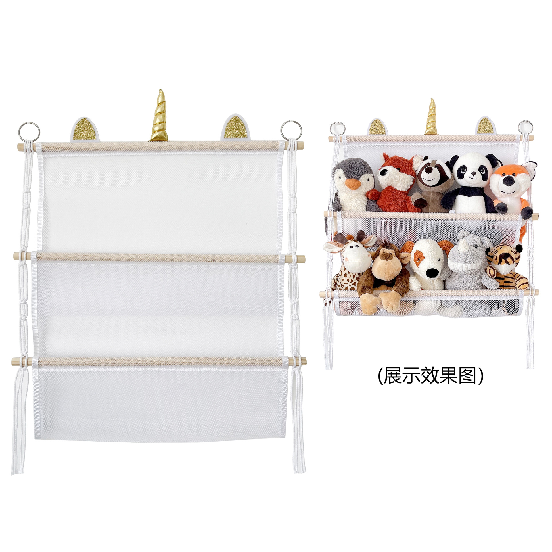 storage rack simple decoration 2-layer children's room book doll storage ornaments wooden stick plush toy storage net pocket