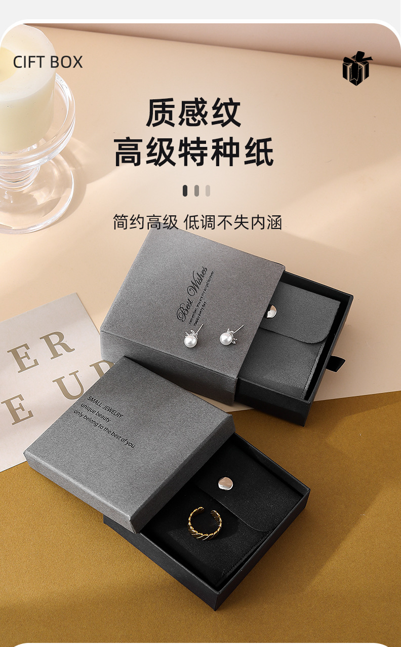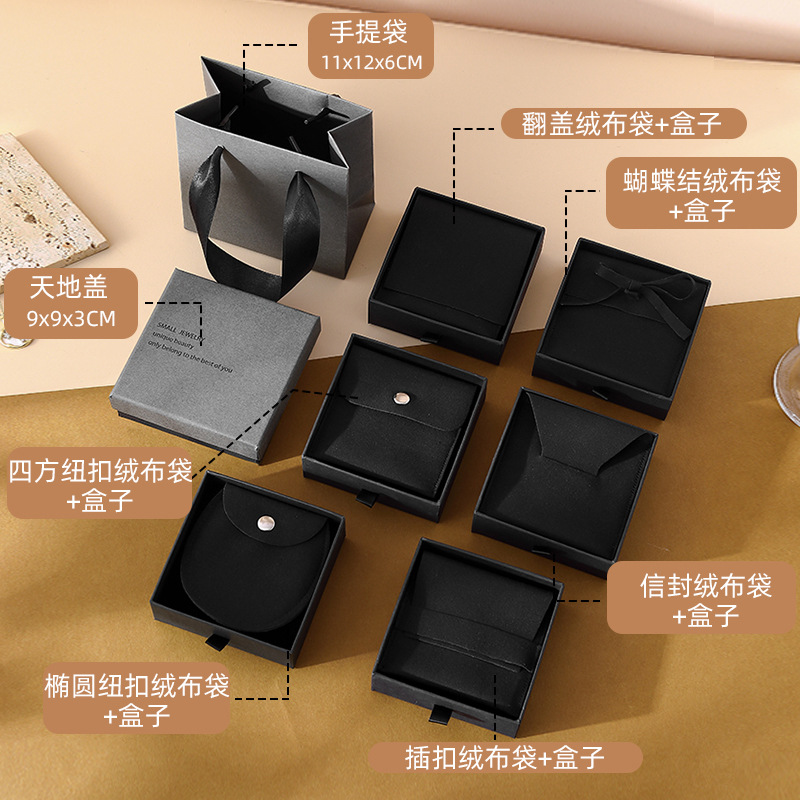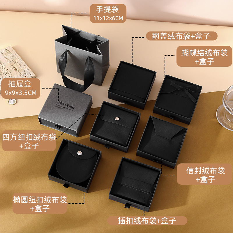 ash black drawer box 9*9*3.5 + gray velvet bag; envelope velvet bag + box