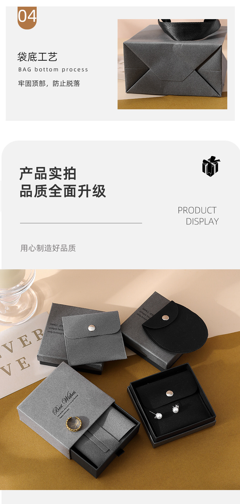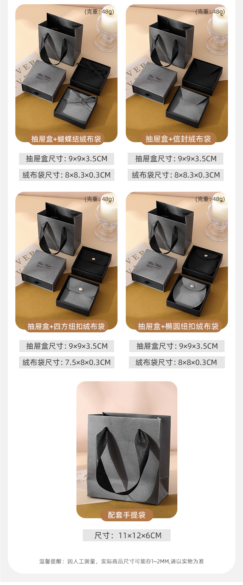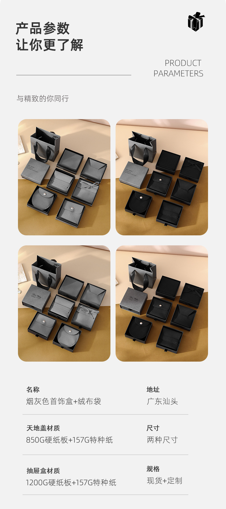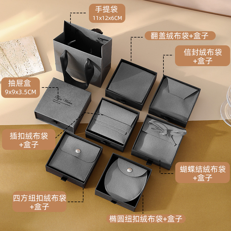 ash black drawer box 9*9*3.5 + gray velvet bag; flip velvet bag + box