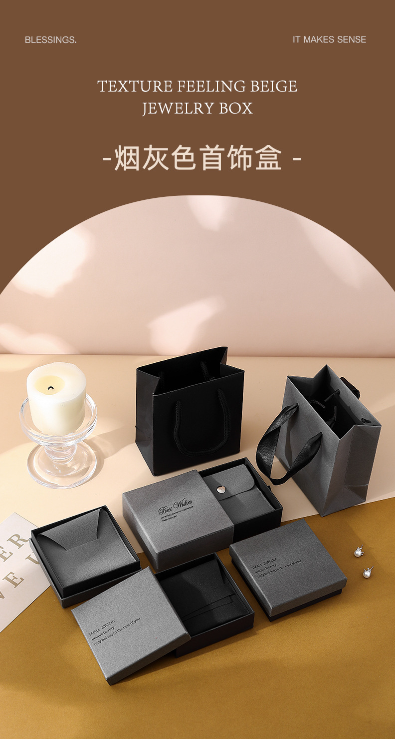 ash black drawer box 9*9*3.5 + gray velvet bag; oval button velvet bag + box