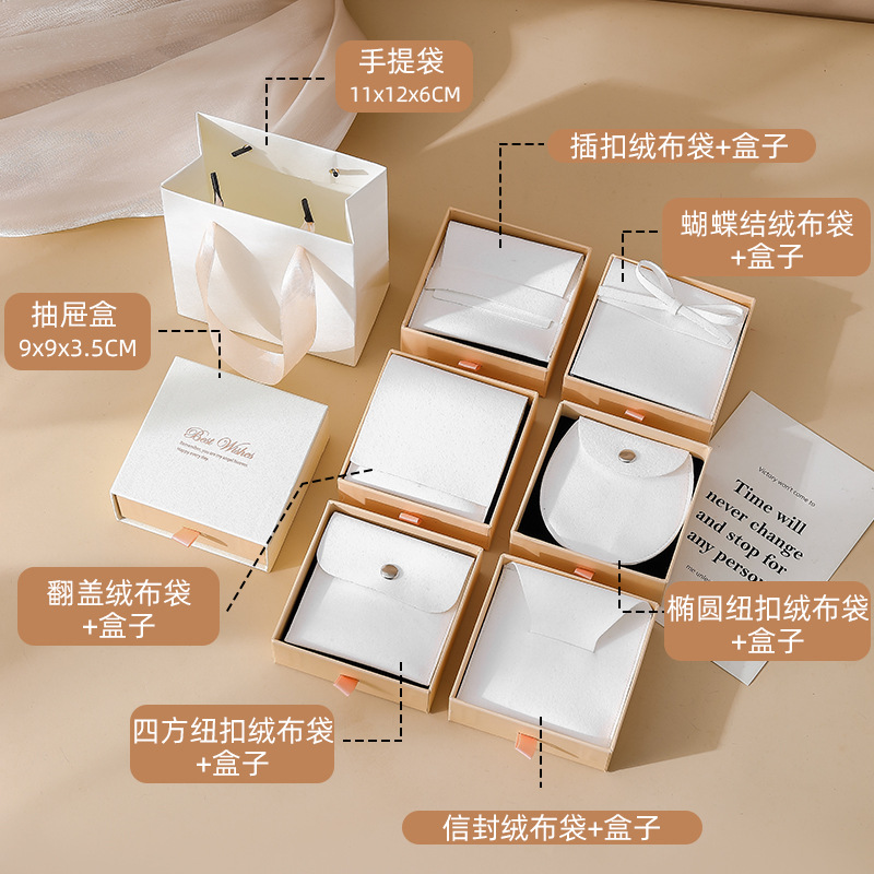 white powder drawer box 9*9*3.5 + apricot flannel bag; envelope flannel bag + box