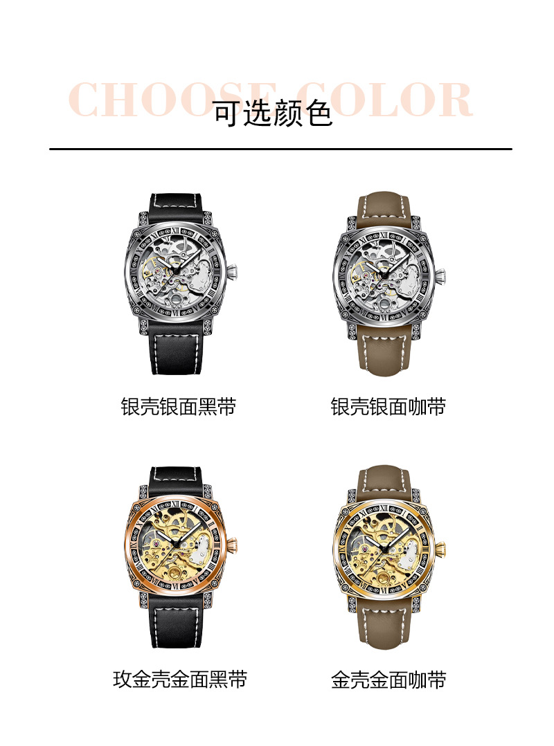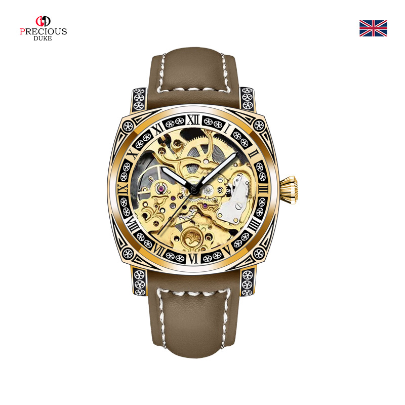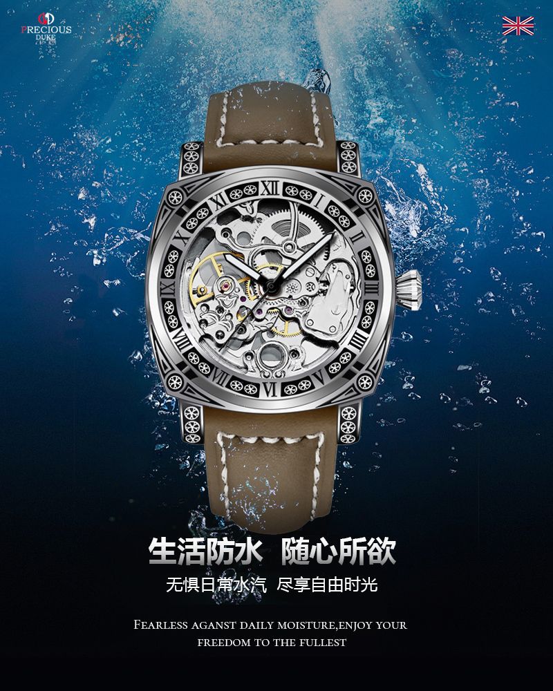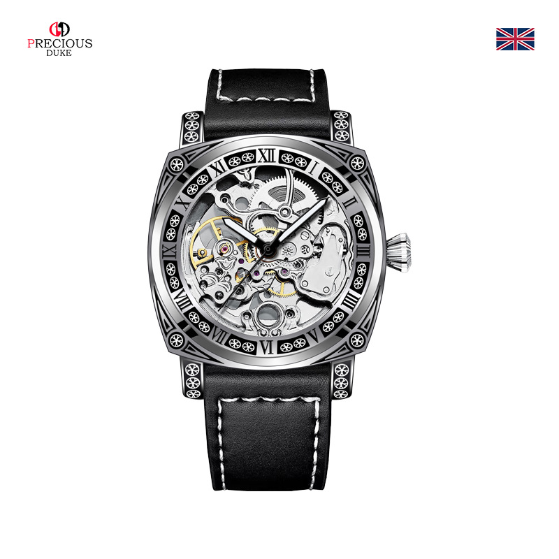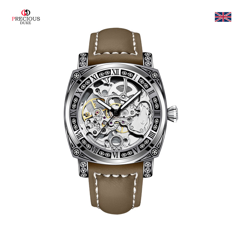 silver case/white surface/brown belt