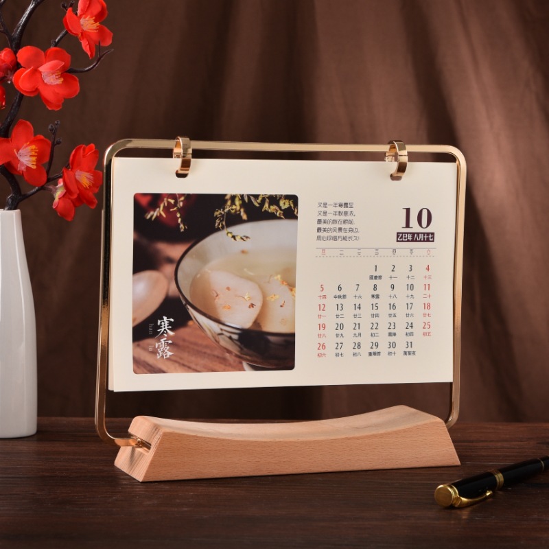 vertical gold-plated plastic ring log calendar with base