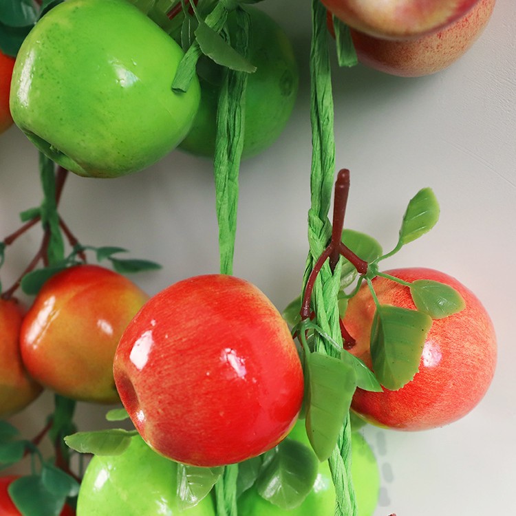 a string of red apples with leaves