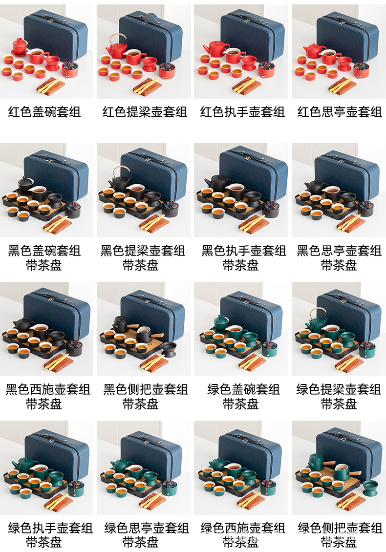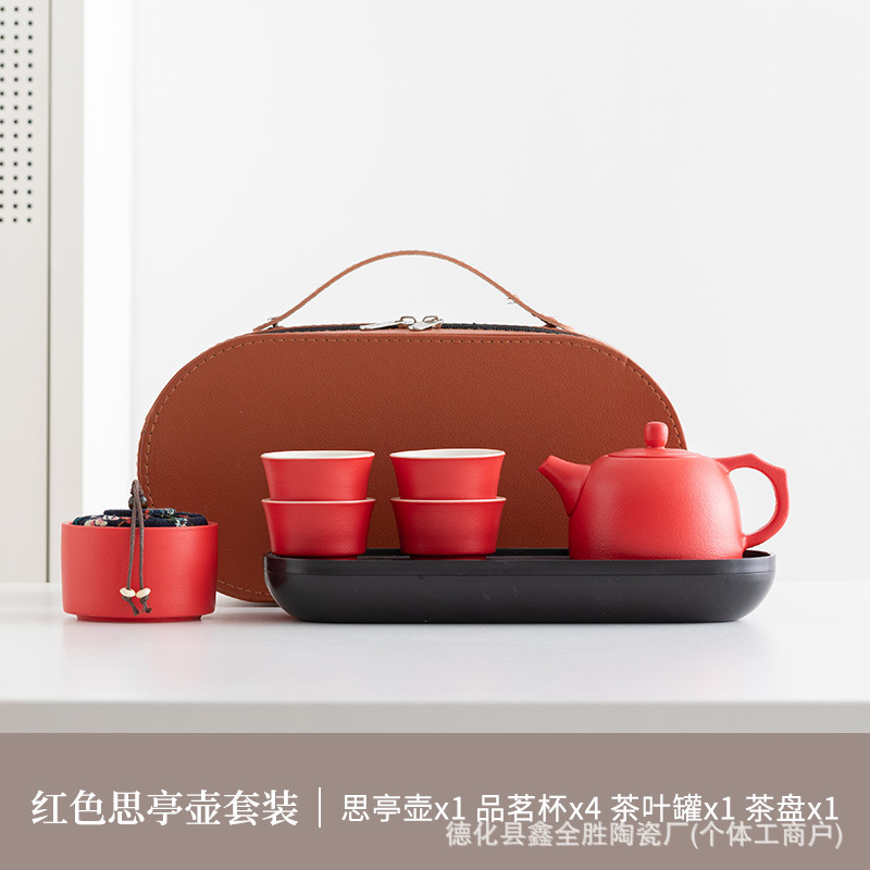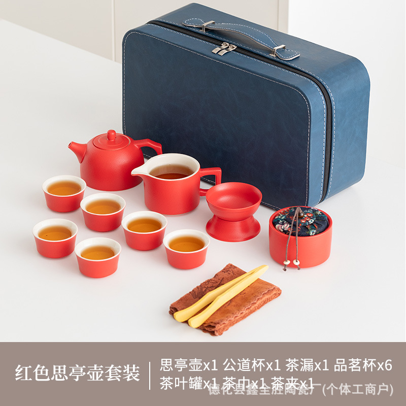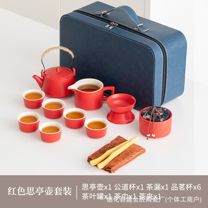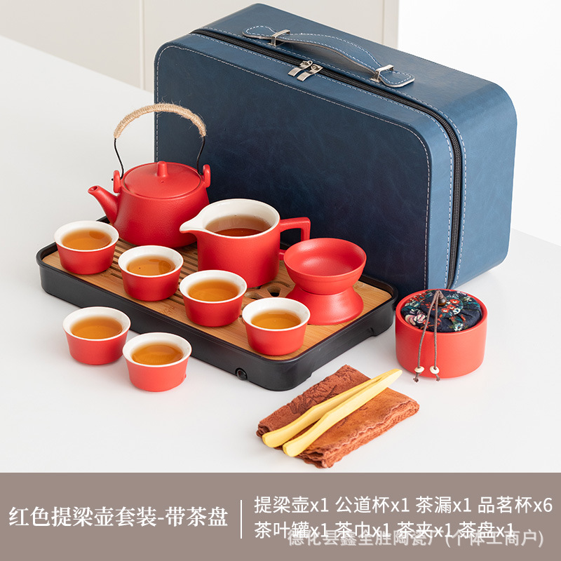 red loop-handled teapot suit + tea tray + blue bag