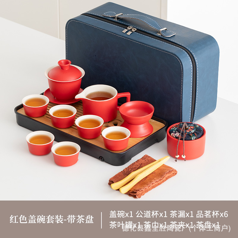 red gaiwan set + tea tray + blue bag