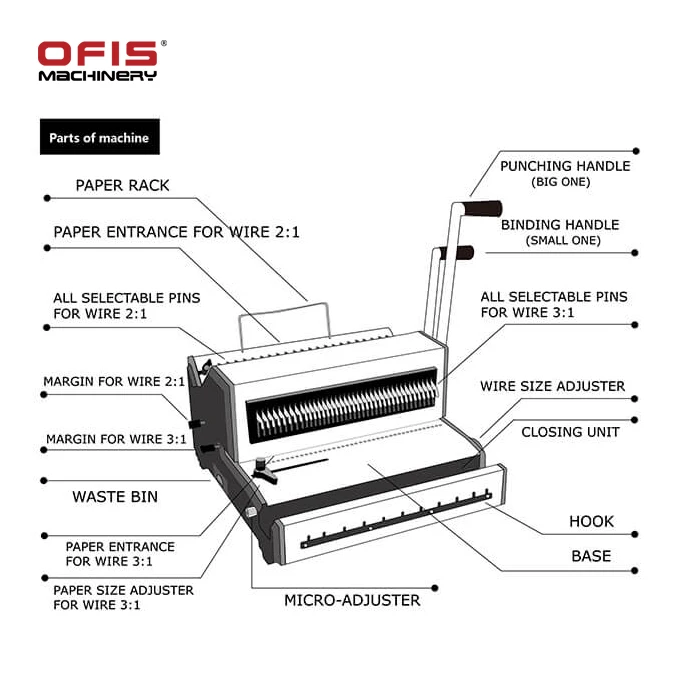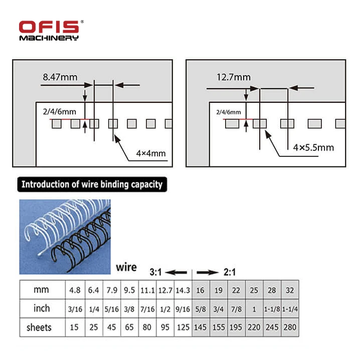 2:1+3:1 Double wire binding machine is a popular commercial book binding method, and is known by a number of different names, including twin loop wire, wire-o, double loop wire, double-o, ring wire and wirebind. With this binding method, users insert their punched pages to a "C" shaped spine. Documents that are bound with wire binding can open completely flat on a desk and allow for 360 degree rotation of bound pages.