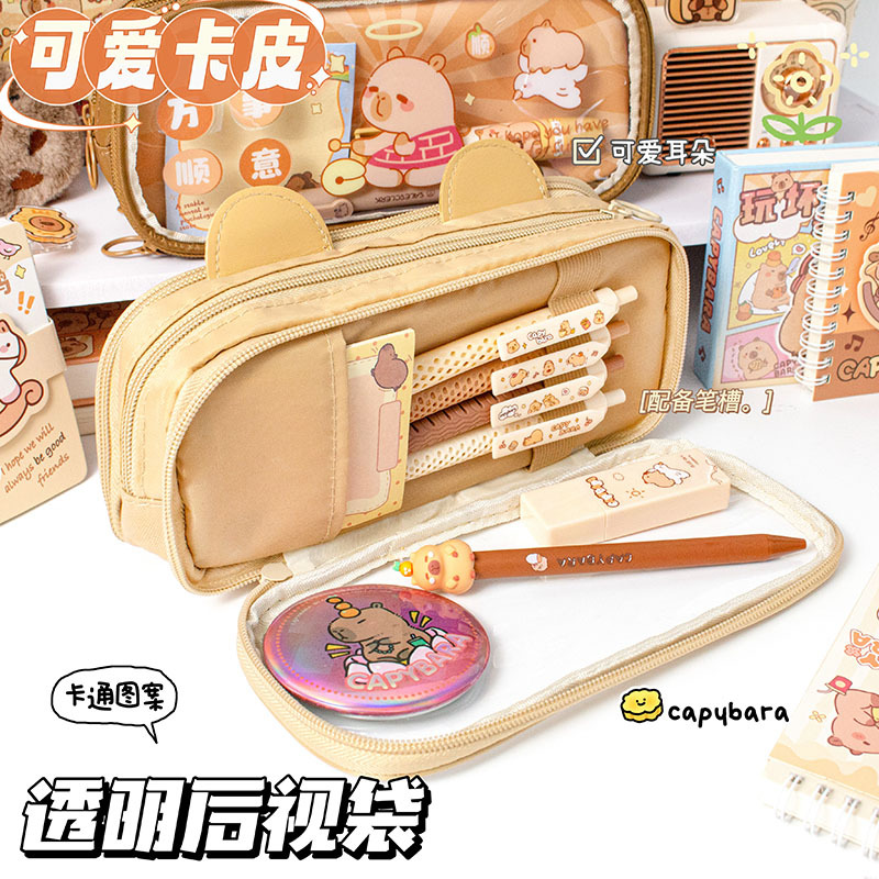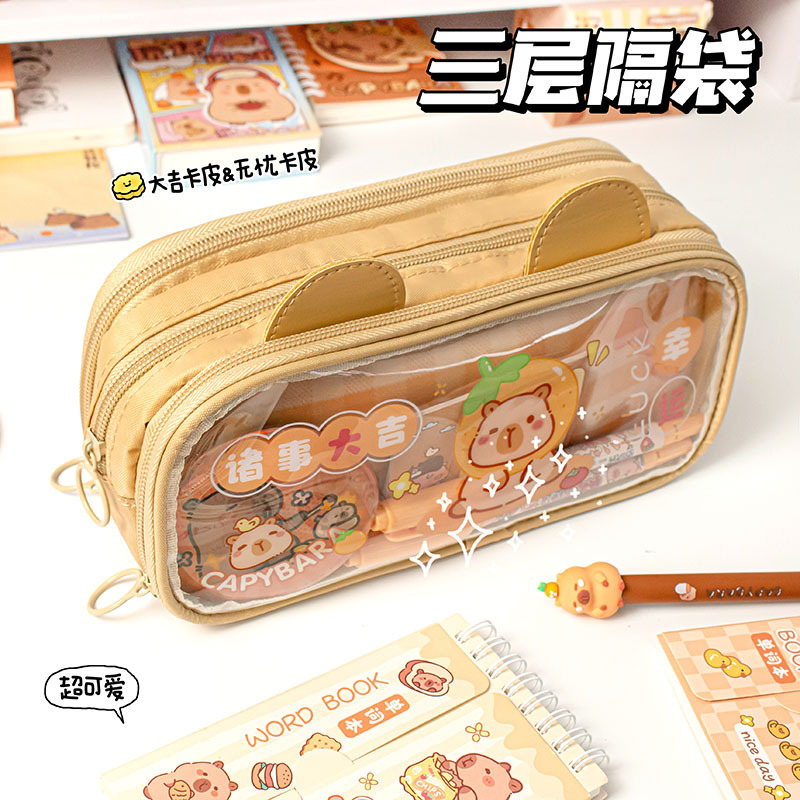daji khaki transparent three-layer pencil case 3373