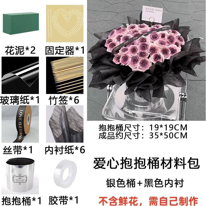 silver barrels + black tissue paper [love flower pot bouquet] can be inserted with 33 flowers; as shown in the figure
