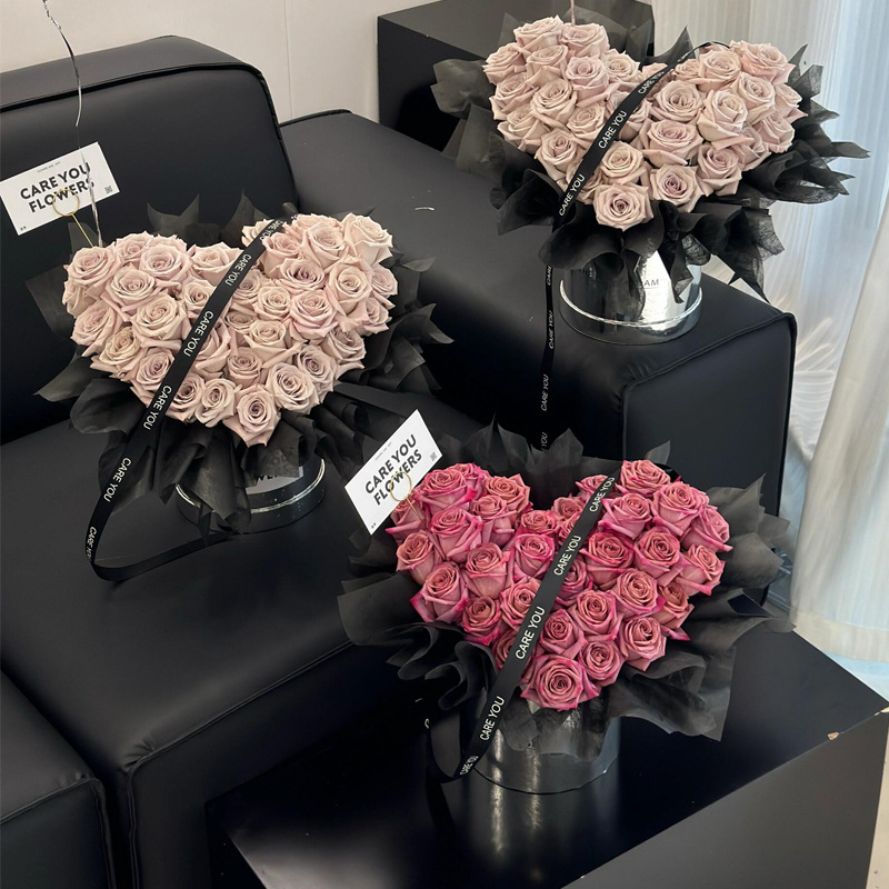 black barrel + black tissue paper [love flower pot bouquet] can be inserted with 33 flowers; as shown in the figure