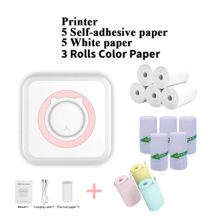 c15 pink +5 rolls thermosensitive paper +5 rolls self-adhesive thermo-sensitive paper thermosensitive paper +3 rolls colored paper +5 pieces crayon