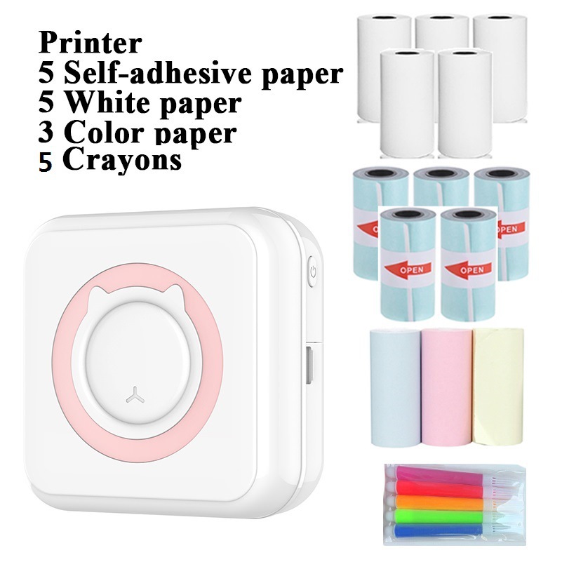 c15 pink +5 rolls thermosensitive paper +5 rolls self-adhesive thermo-sensitive paper thermosensitive paper +3 rolls colored paper +5 pieces crayon