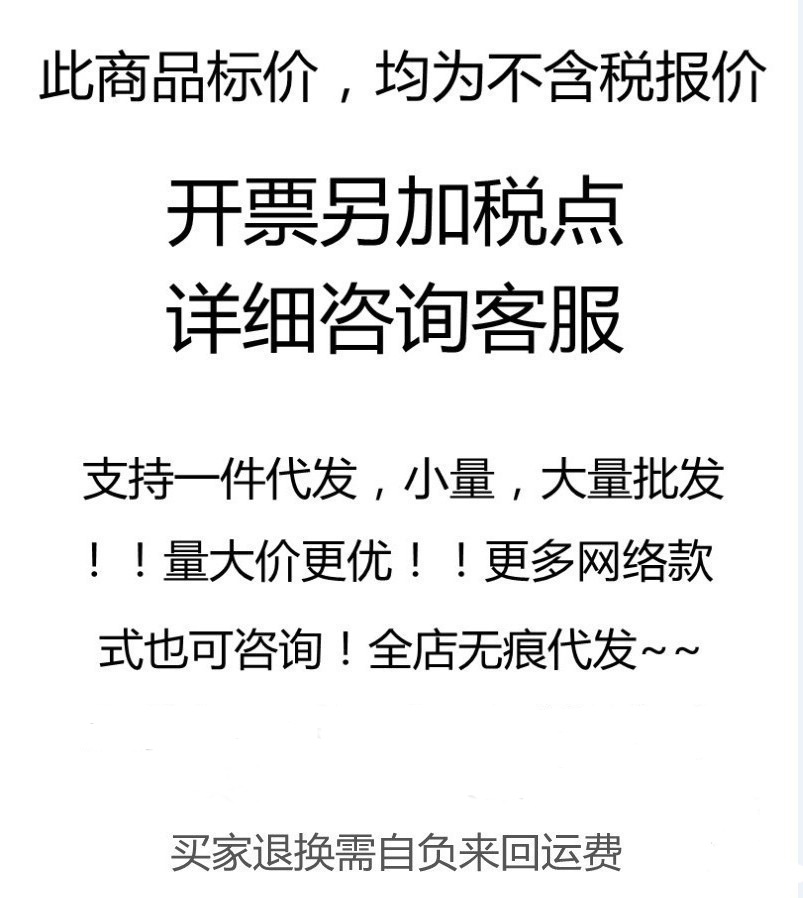 Small business operation, low profit margin, if the sold products have damage, please take photos and contact customer service for after-sales processing. Due to the large number of styles, there may be individual styles out of stock. If there is a stock shortage and we cannot contact the customer, we will send the available stock first, and if there is a stock shortage, we will contact the customer service for a refund. This store does not support any reason for quality problems, sales, etc. to return the goods. Please note that the 7-day reason only applies to individual self-used customers, and wholesale customers do not enjoy the 7-day reason. Thank you for your cooperation. The price of the small store does not include the opening of the bill. If you need to open the bill or custom, please contact the manager's WeChat.