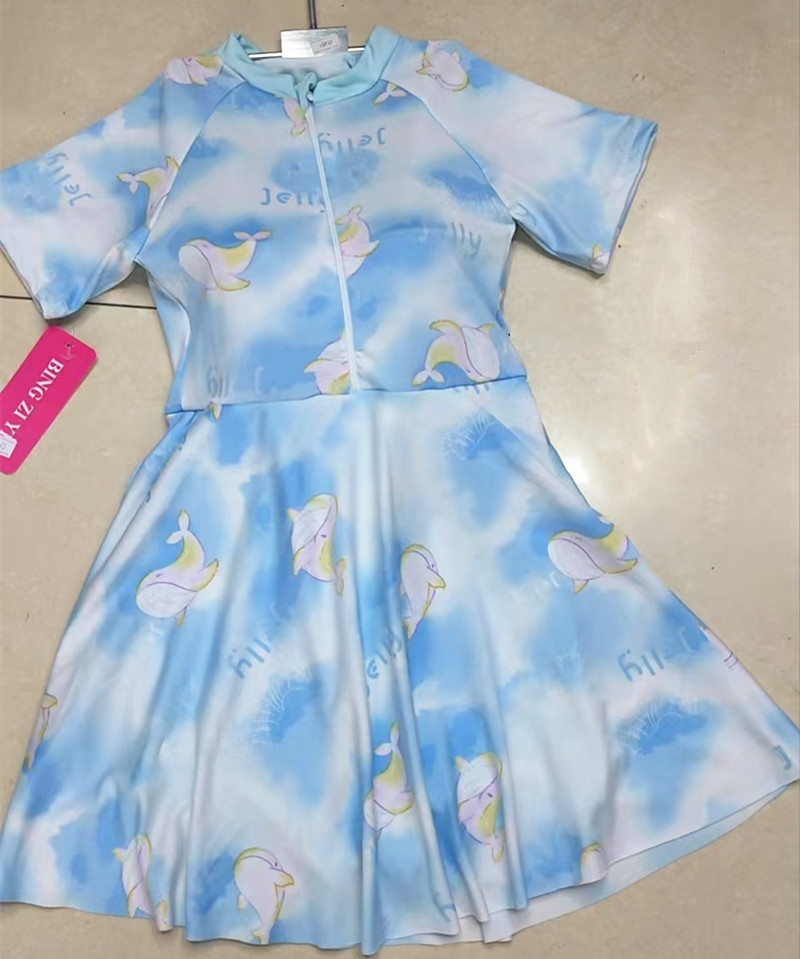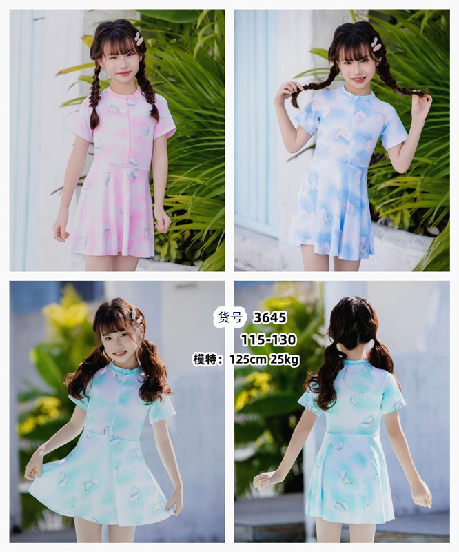 Girls' short-sleeved one-piece swimsuit. Suitable for ages 5-8. Milk silk fabric. Good elasticity. Good touch.