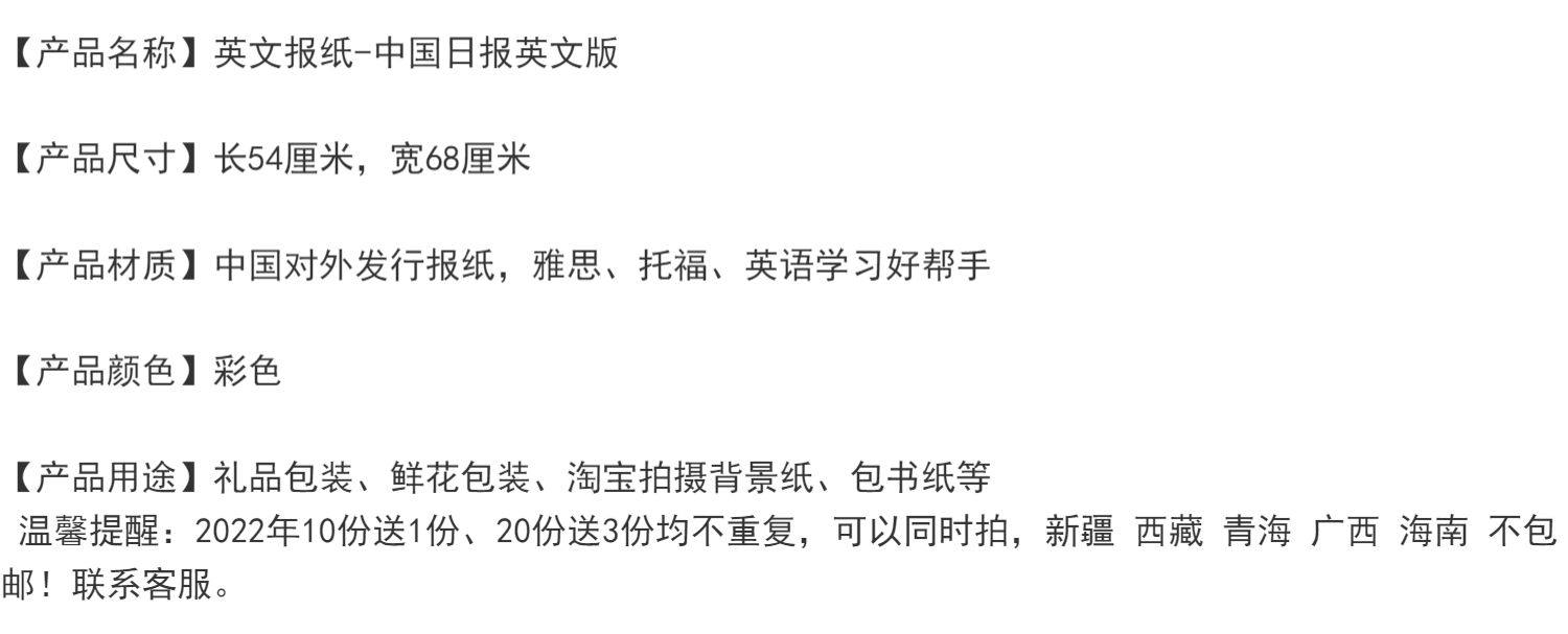 | china daily test pack (1 newspaper 3-5) | CN¥ 4.9 | 200 piece available |