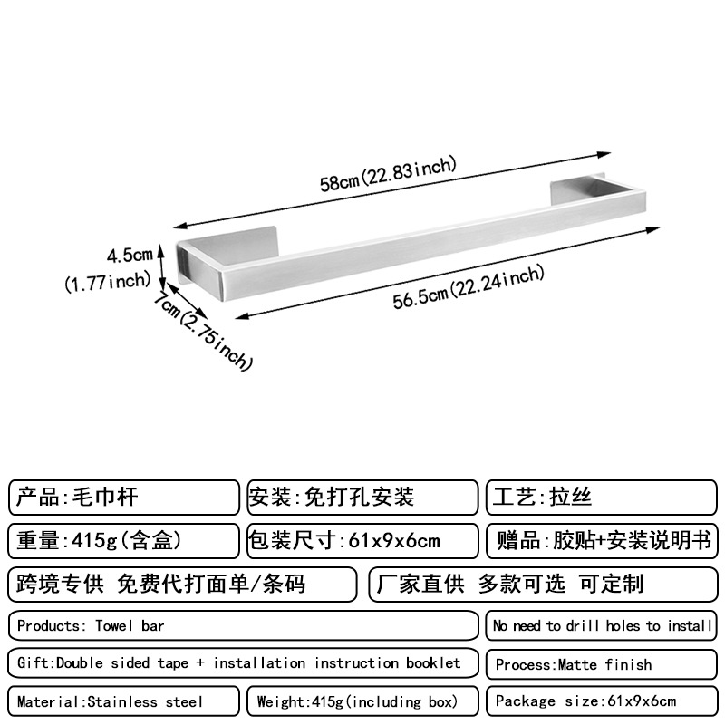 [exclusive for cross-border] punch-free square tube towel bar silver