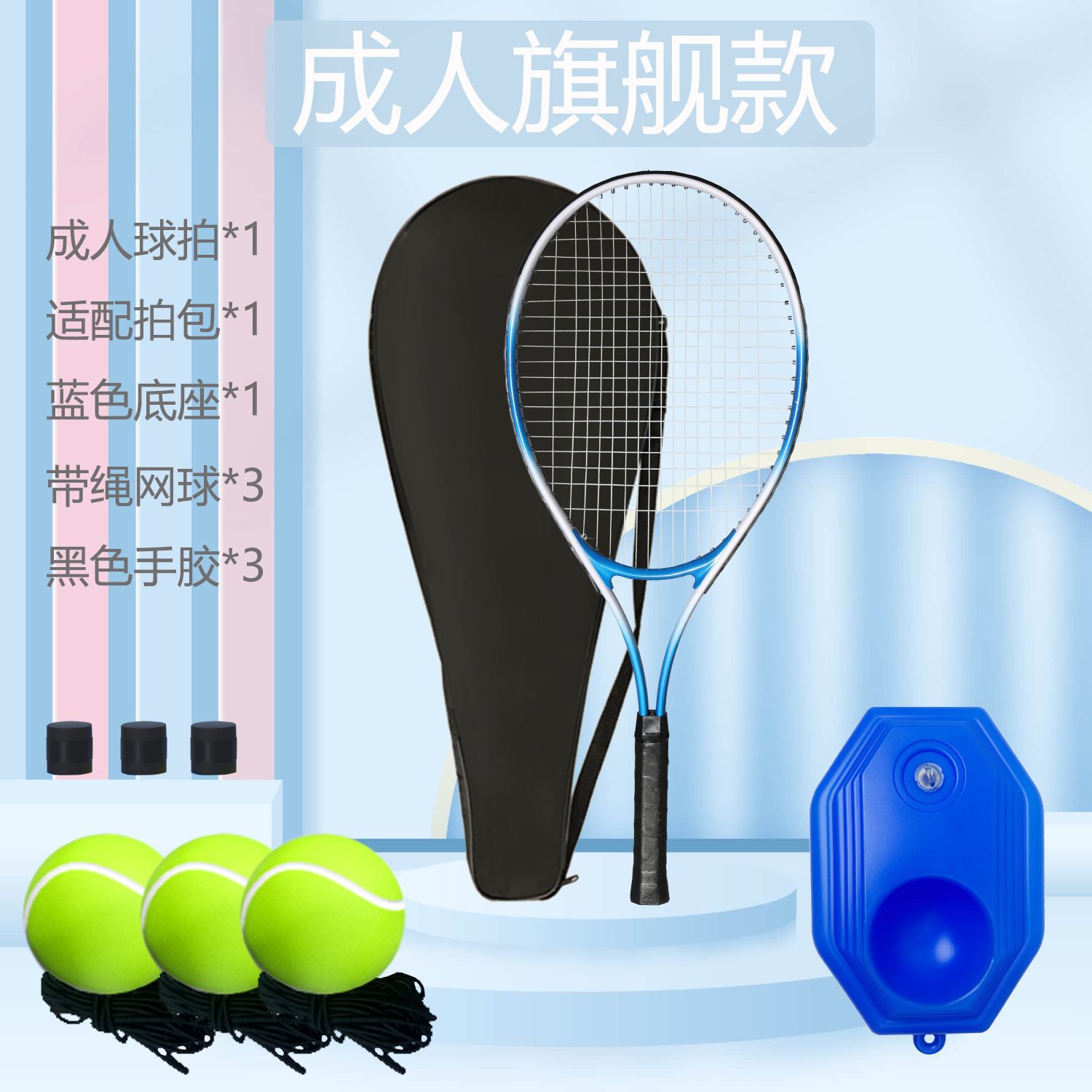 [adult flagship-blue] adult racket + ball bag + base + high-elastic tennis * 3 + grip tape * 3