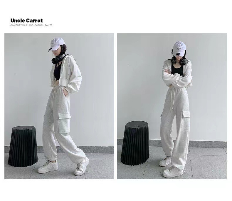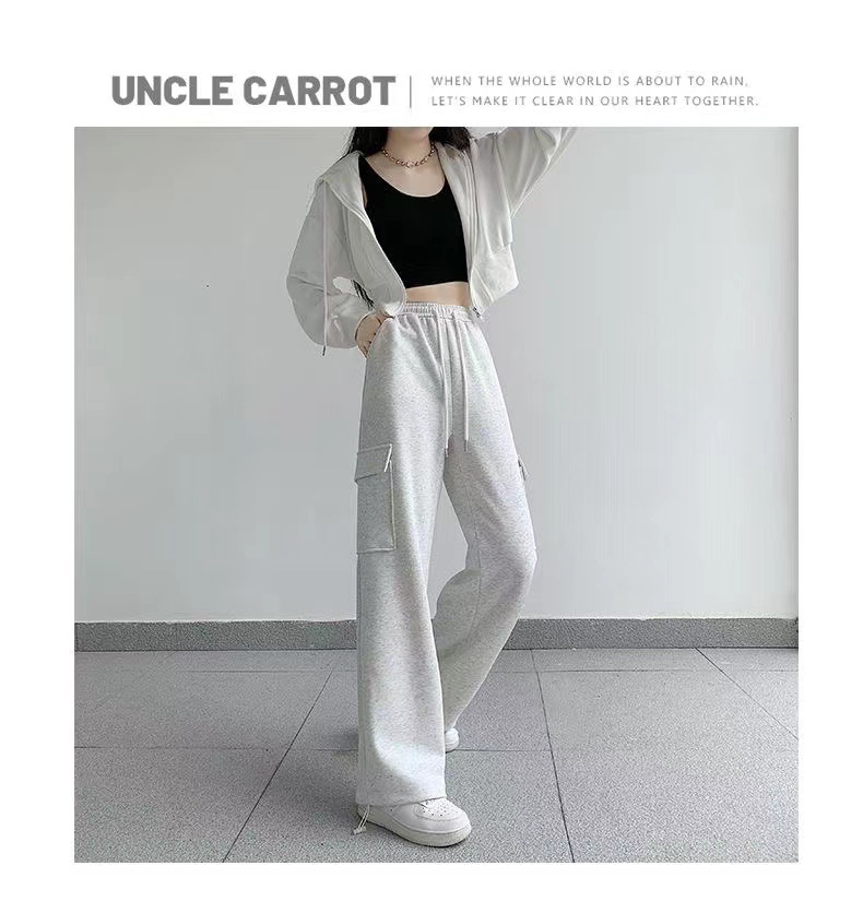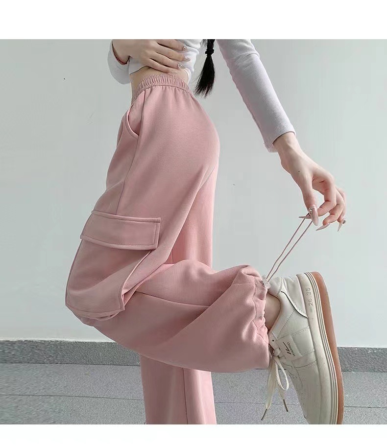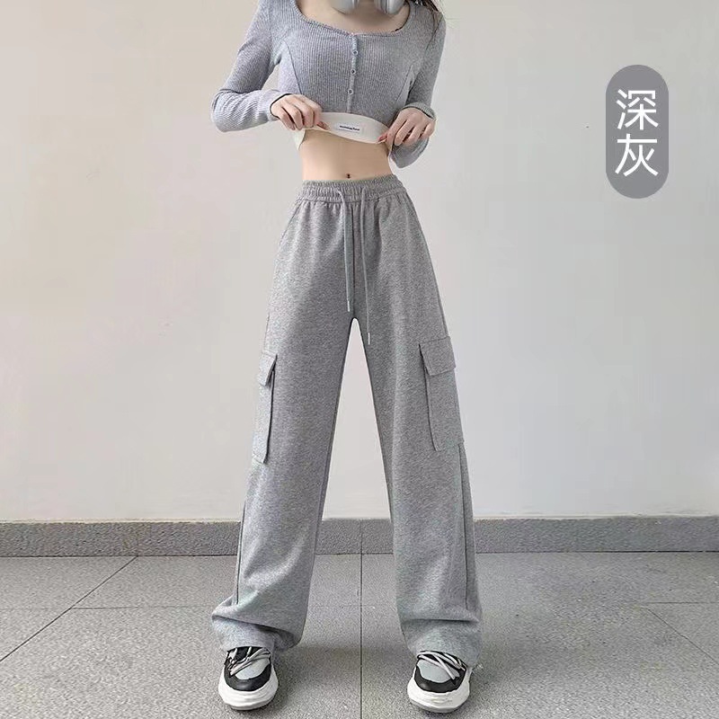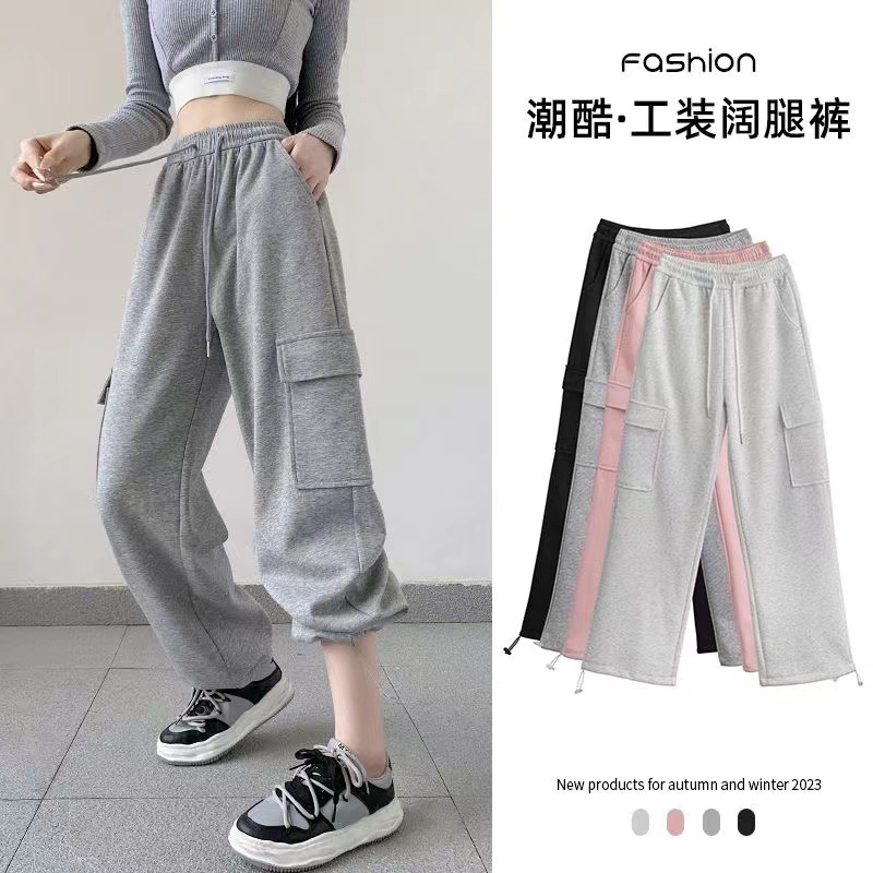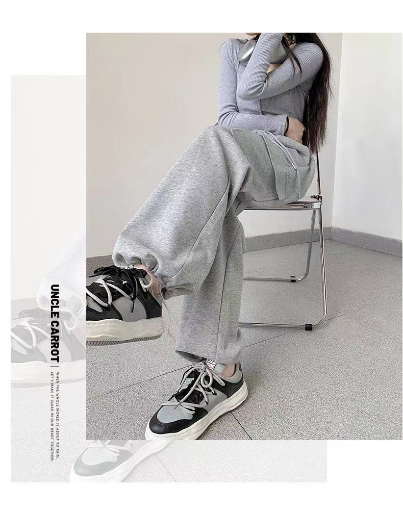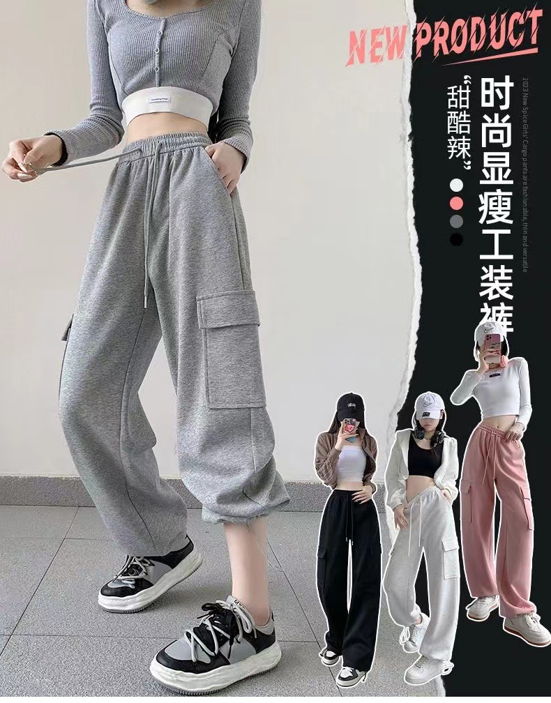 large pocket sports pants female spring and autumn new casual loose high waist slimming gray ankle-tied sweatpants american overalls