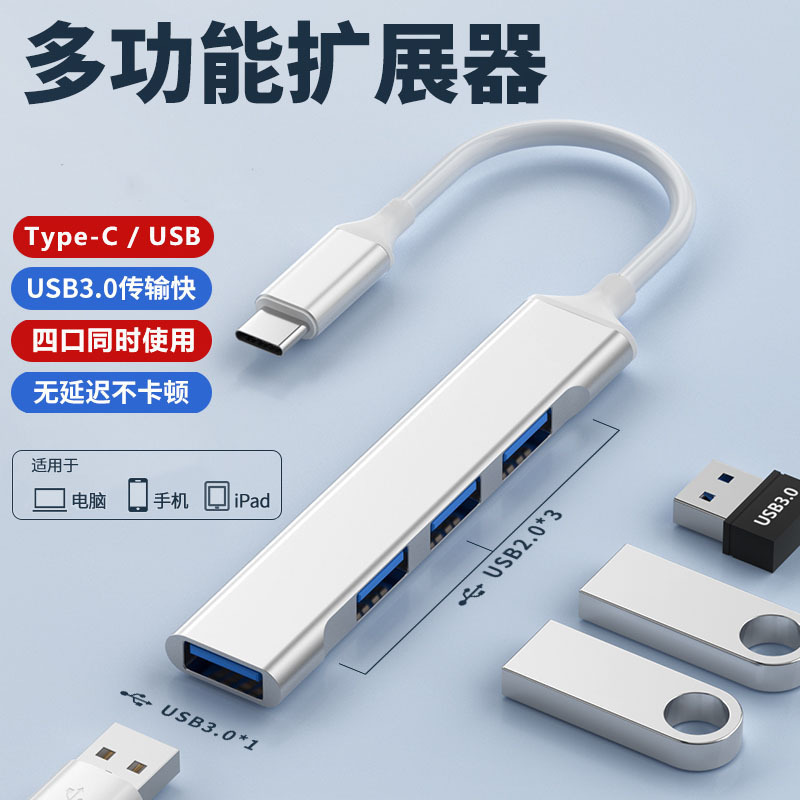 Product features: Four-in-one interface, high-speed USB 3.0, compatible with some notebooks and OTG-enabled mobile phones, fast read of USB drives, supports mobile phone connection to mouse and keyboard, instantly turning a mobile phone into a computer, wide compatibility, USB expansion for computers, connecting printers, game controllers, drawing tablets, hard drives, and other peripherals, solving the awkward situation of insufficient USB ports on laptop computers. |