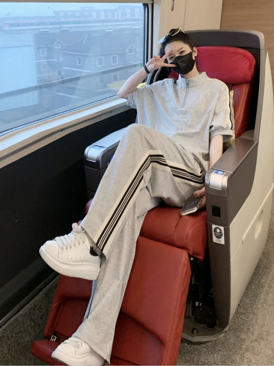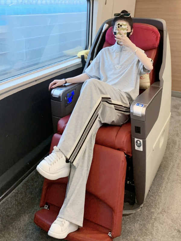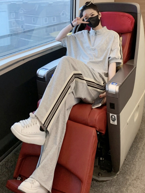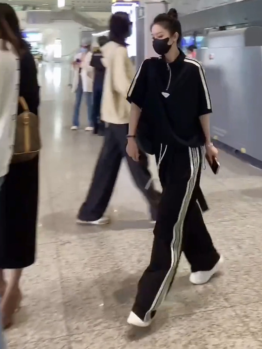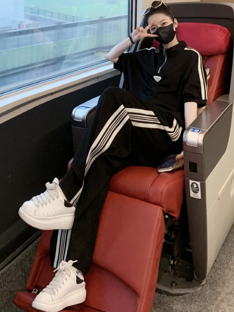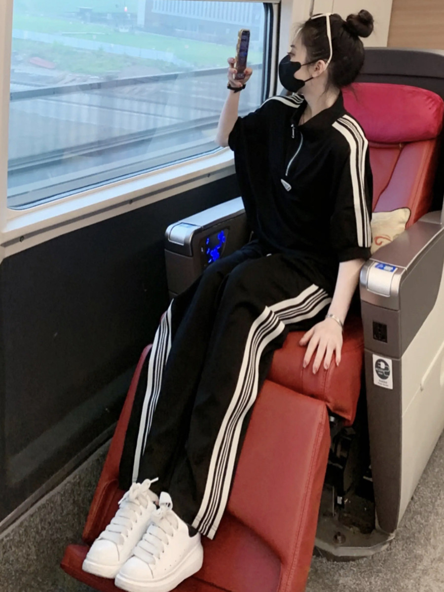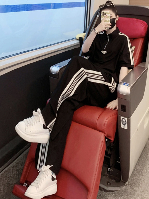 european station brand leisure sports suit women's summer younger fashion black half-sleeved top wide leg pants two-piece set