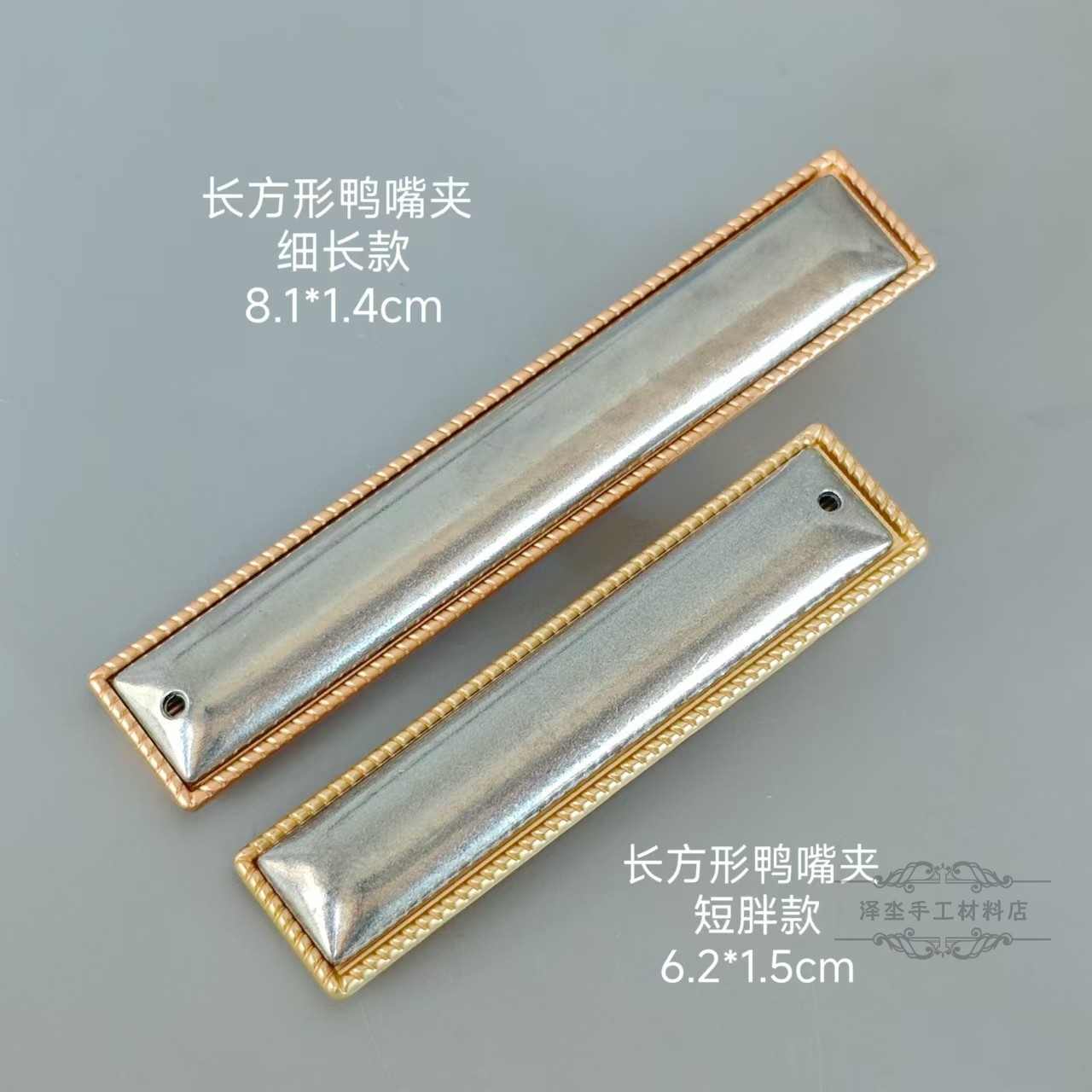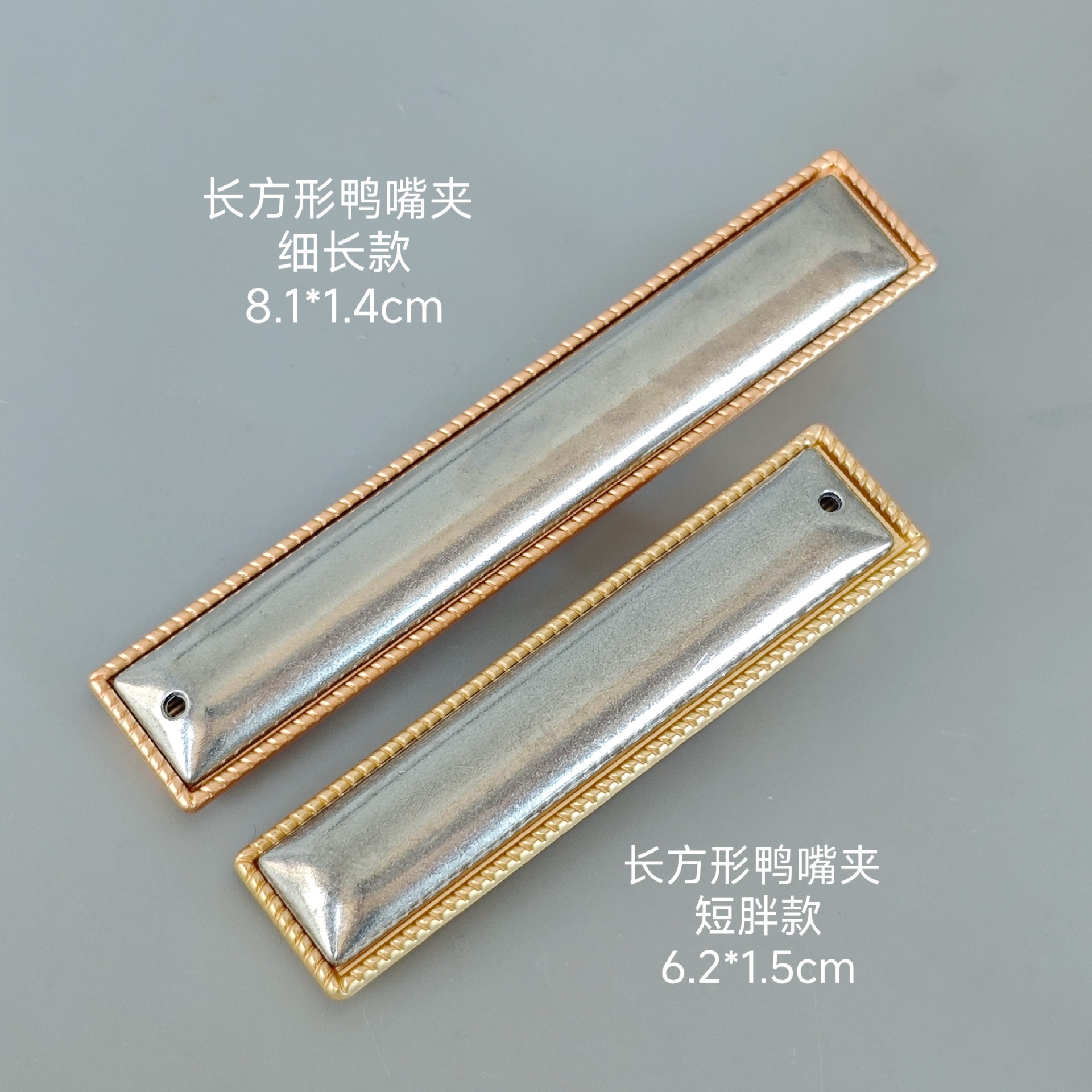 one rectangular duckbill clip short and long each