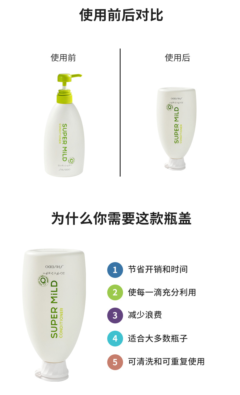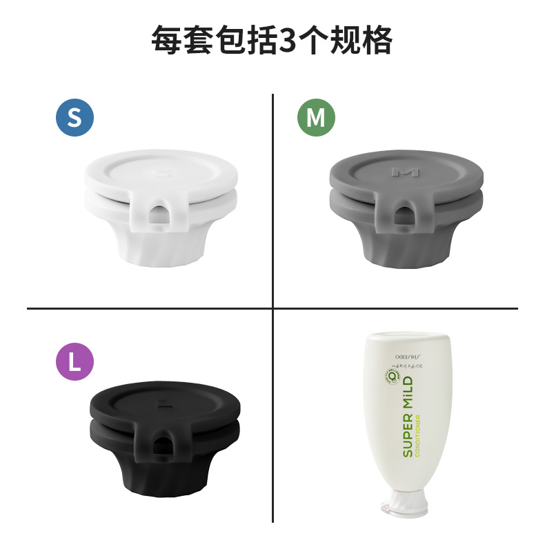 Product application scenarios: shampoo, shower gel, conditioner, body lotion, baby oil for use in the bathroom; dishwashing liquid, tomato sauce, and other condiment bottle leak-proof lids for use in the kitchen.
