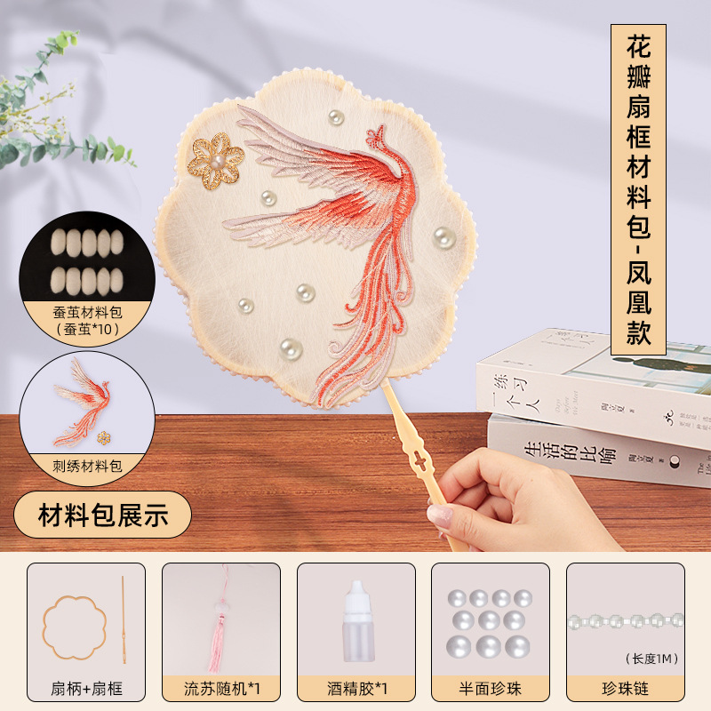 petal fan frame material package + phoenix embroidery stickers +10 white silkworm cocoons