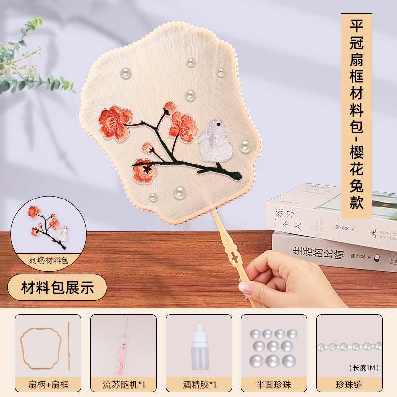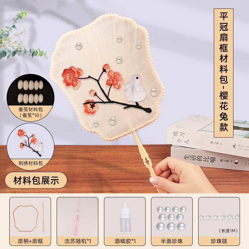 flat crown fan frame material package + cherry blossom rabbit embroidery patch +10 white silkworm cocoons
