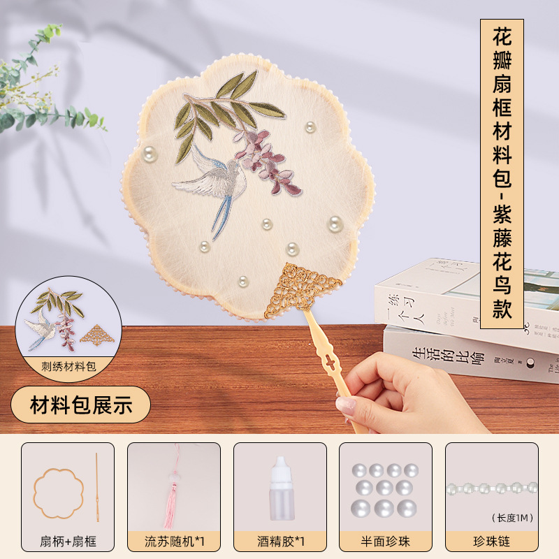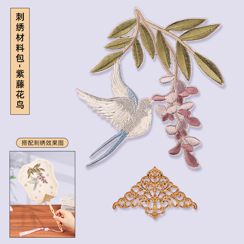 without cocoon-petal fan frame material package + wisteria flowers and birds embroidery patch