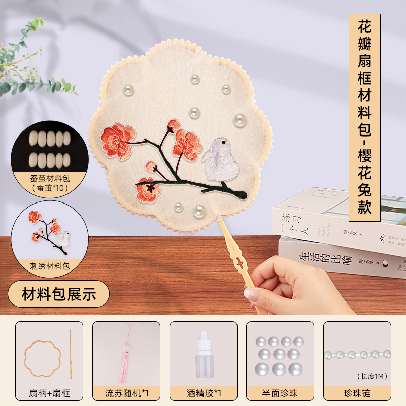 petal fan frame material package + cherry blossom rabbit embroidery patch +10 white silkworm cocoons