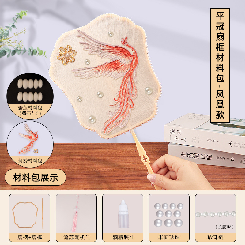 flat crown fan frame material package + phoenix embroidery stickers +10 white silkworm cocoons