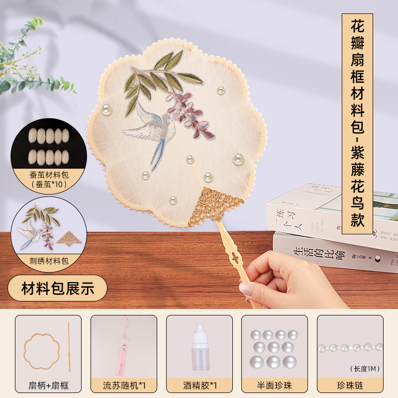 petal fan frame material package + wisteria flowers and birds embroidery patch +10 white silkworm cocoons