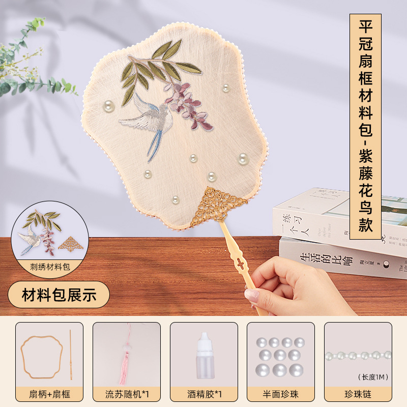without cocoon-flat crown fan frame material package + wisteria flowers and birds embroidery patch