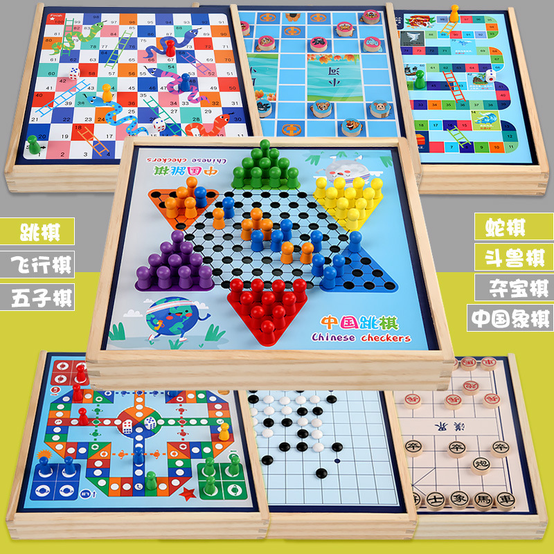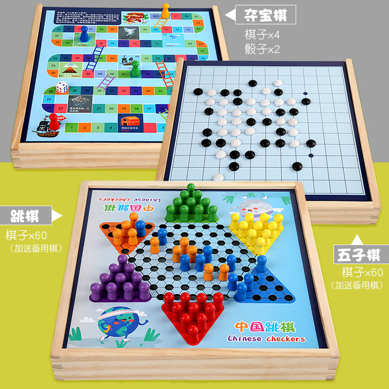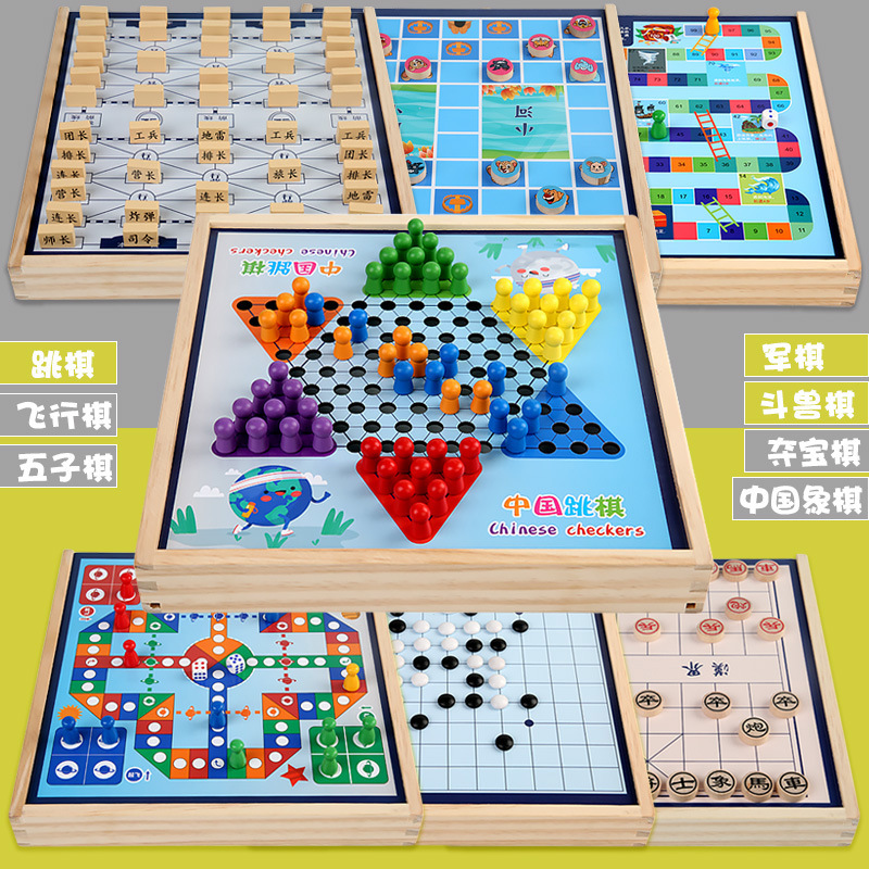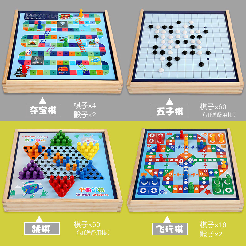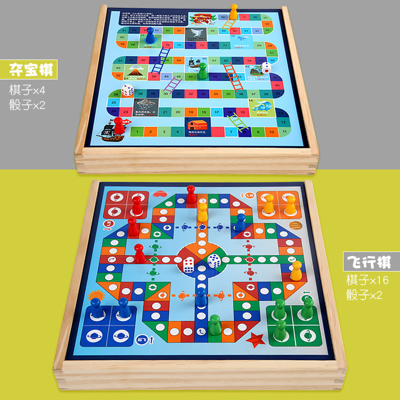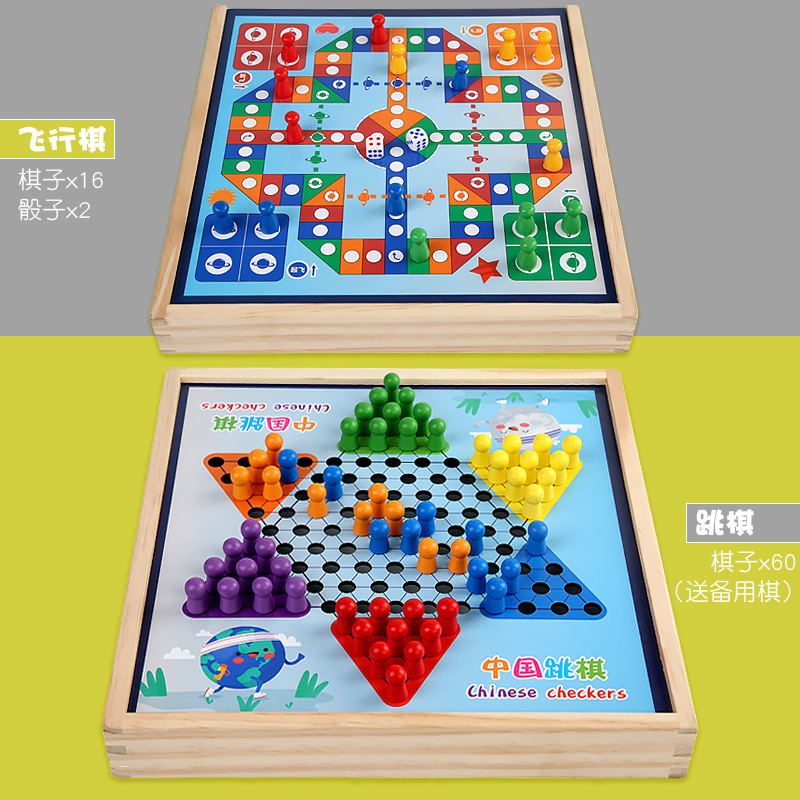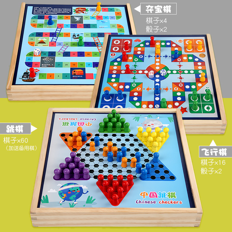 package 7 [large size wooden] three-in-one checkers + aeroplane chess + treasure-winning chess