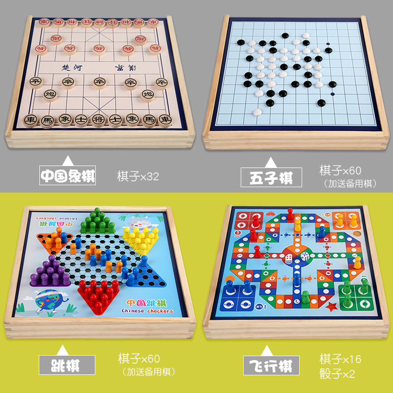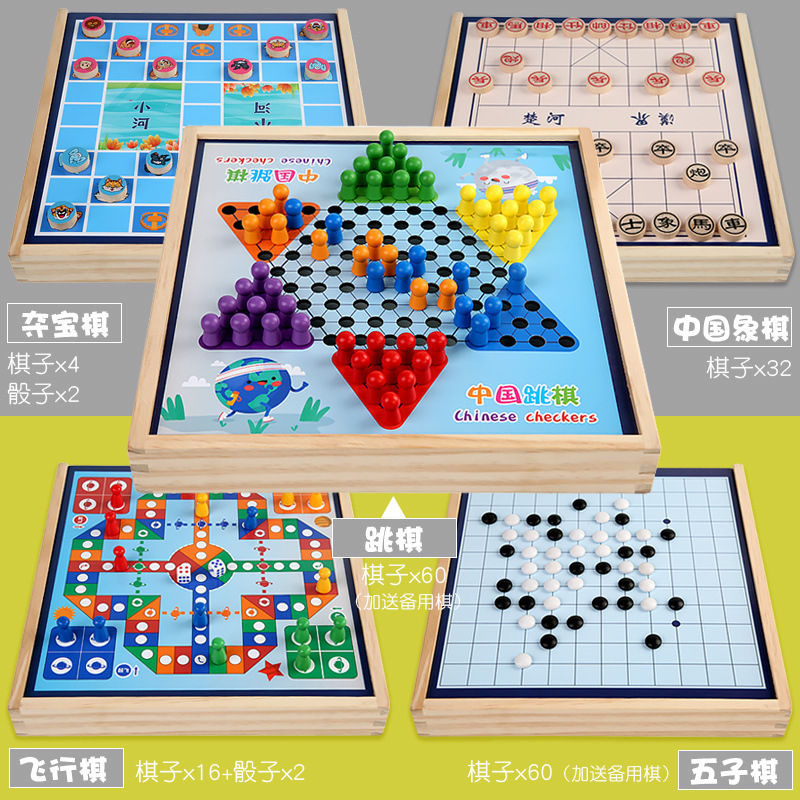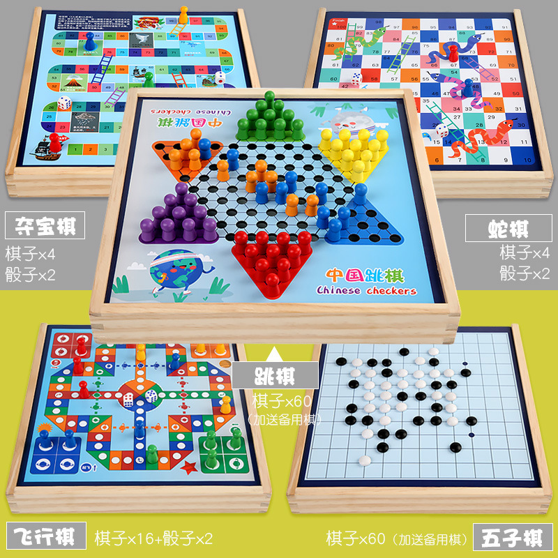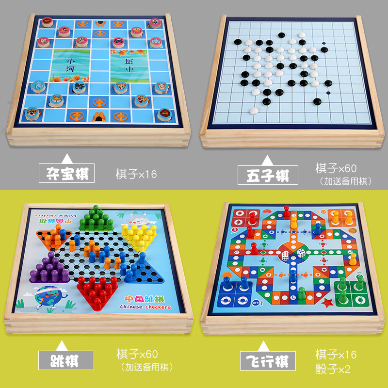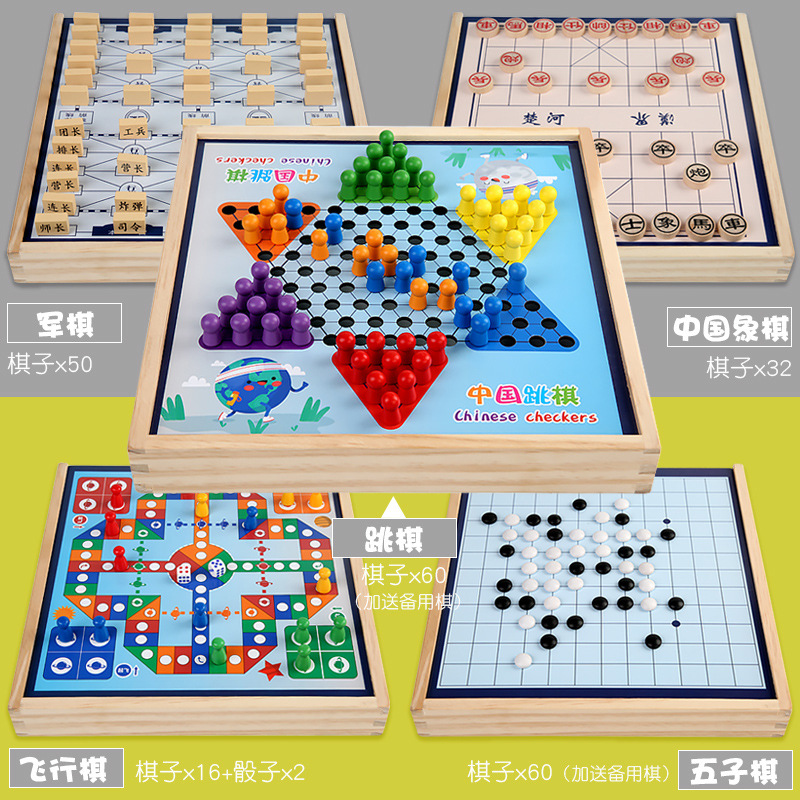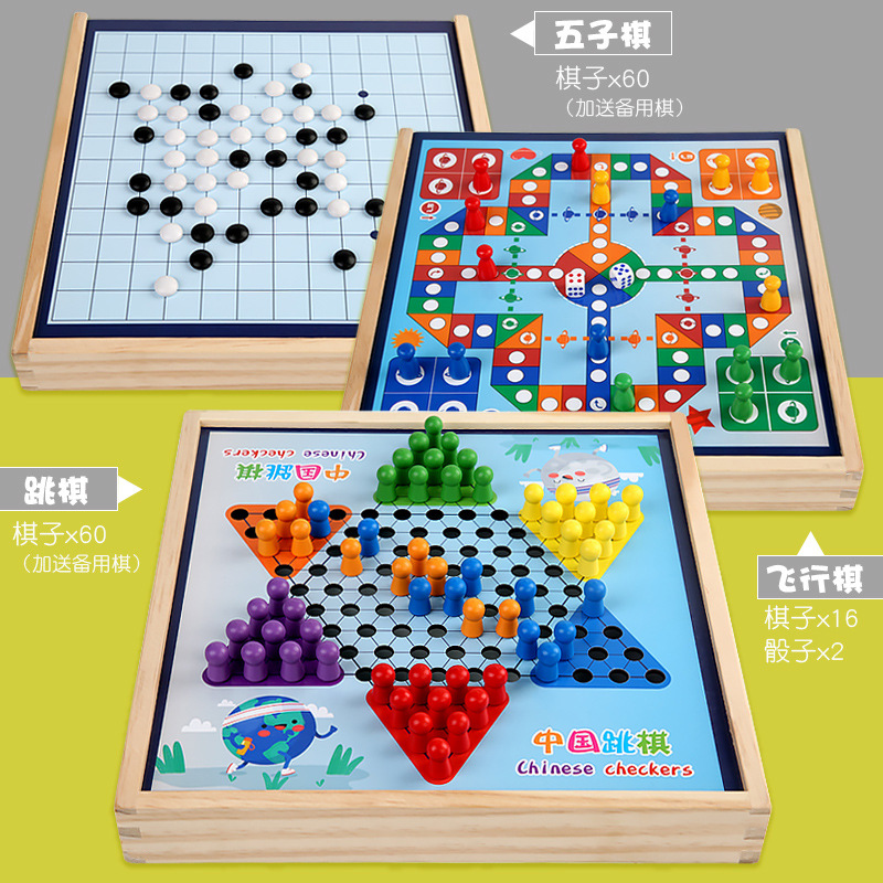 package 6 [large size wooden models] three-in-one checkers + five-in-a-row + aeroplane chess