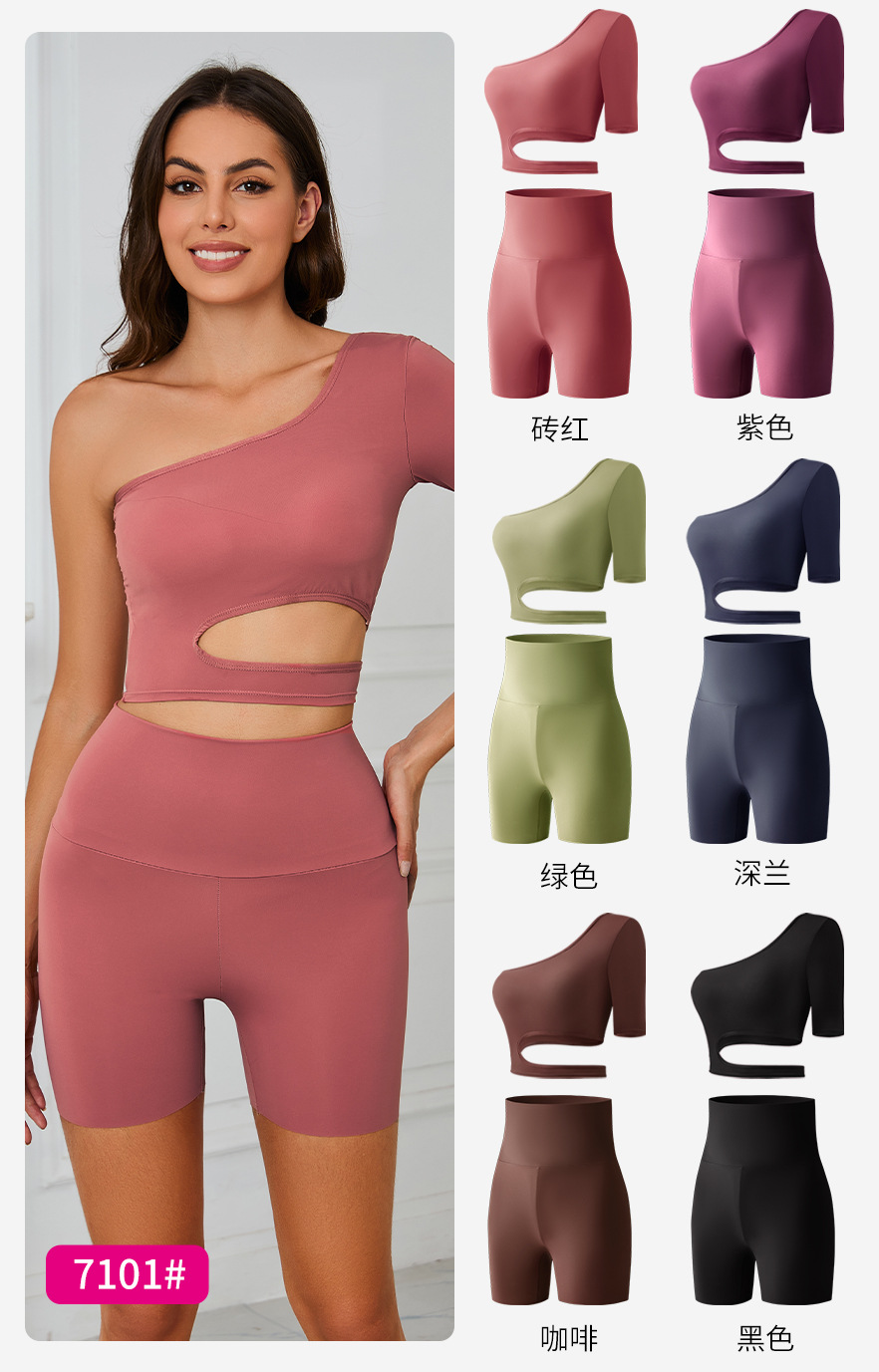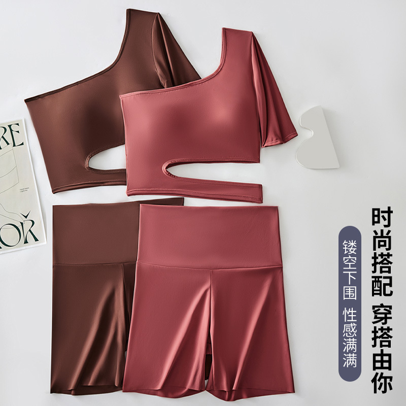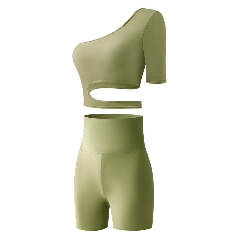 7101# cross-border fashion european and american style sexy oblique shoulder half sleeve sports yoga suit slim fit anti-exposure high elasticity