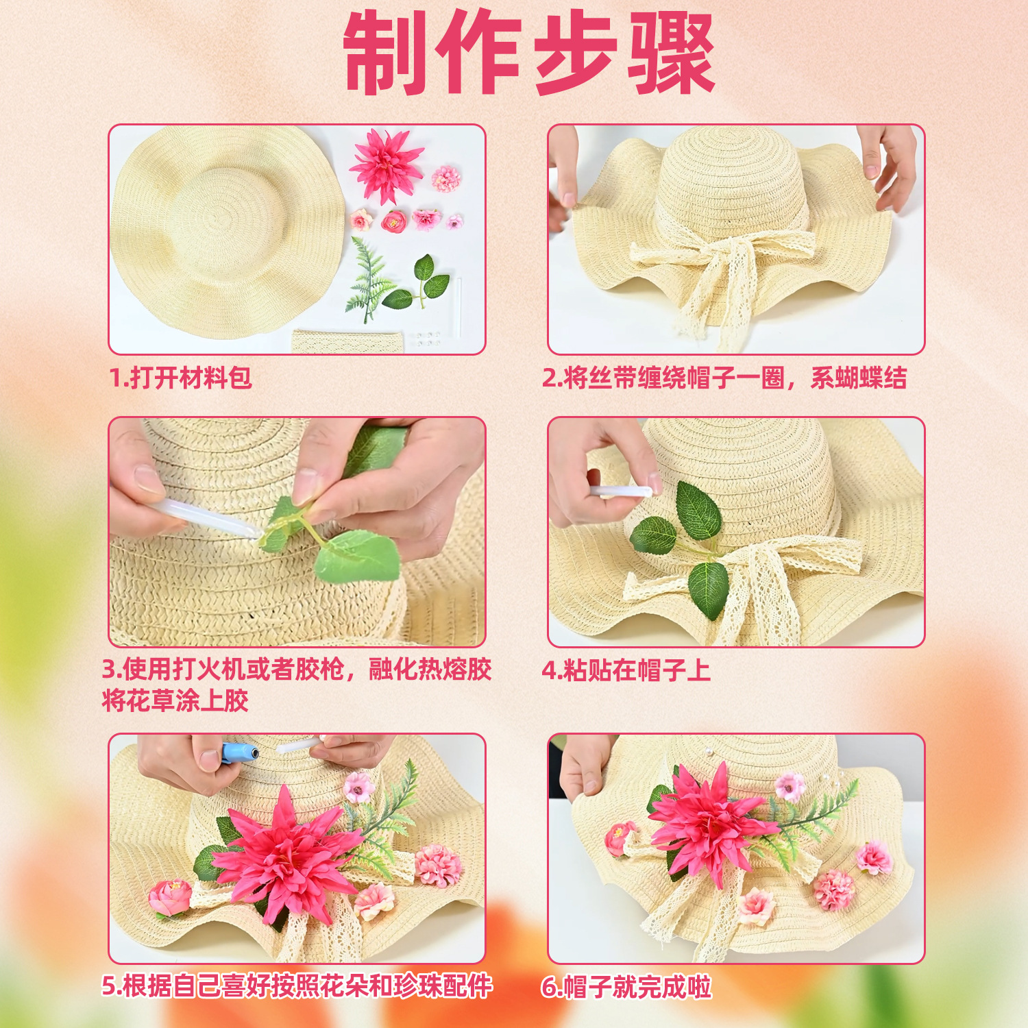 adult floral straw hat material package pink ladies