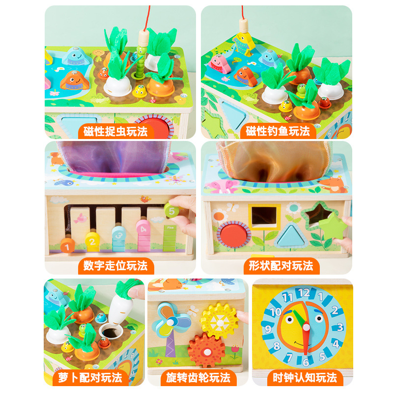 Wooden carrot pulling and bug catching shape matching music playing piano children's multi-functional nine-in-one hundred treasure box educational toy