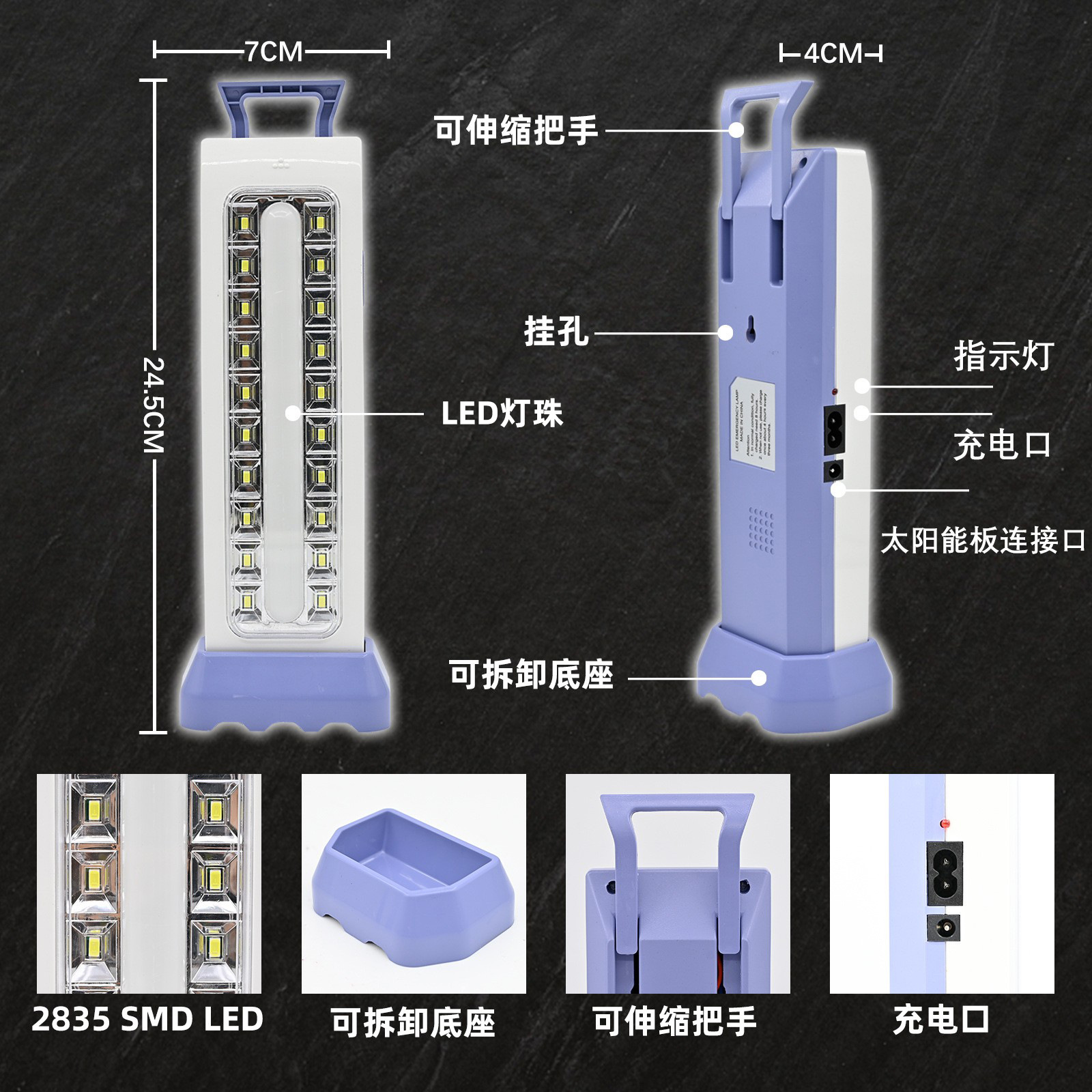 - Emergency lights can be charged by connecting to a 6V solar panel.