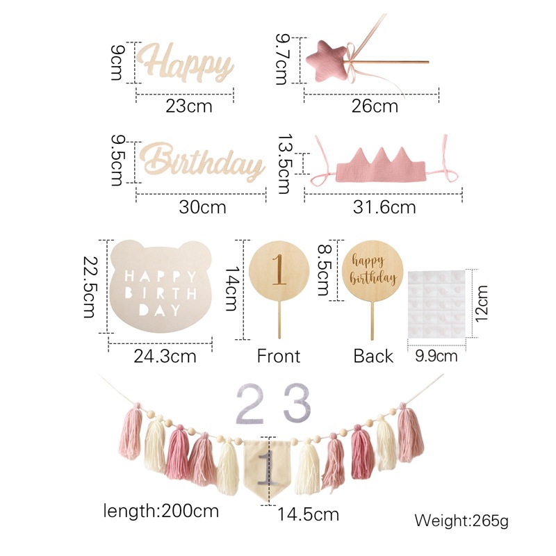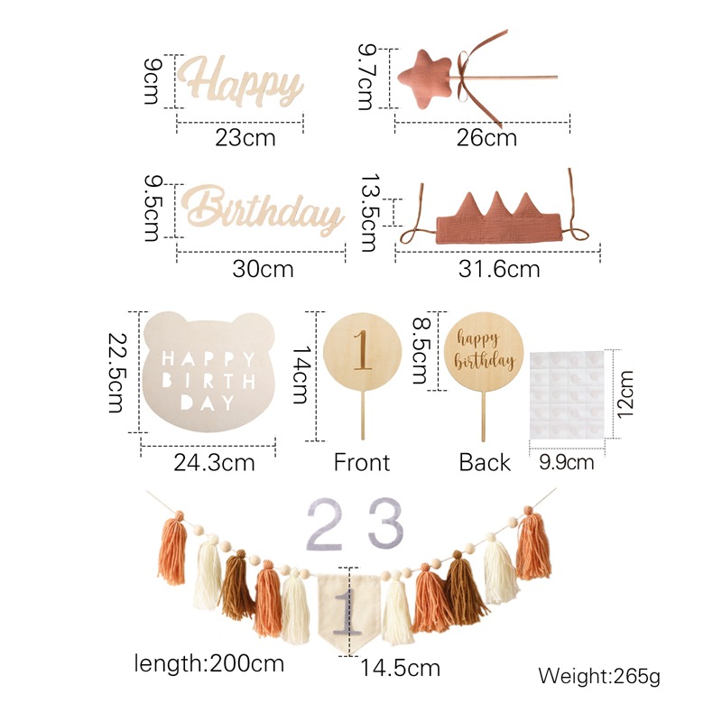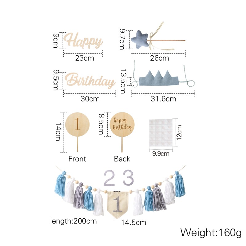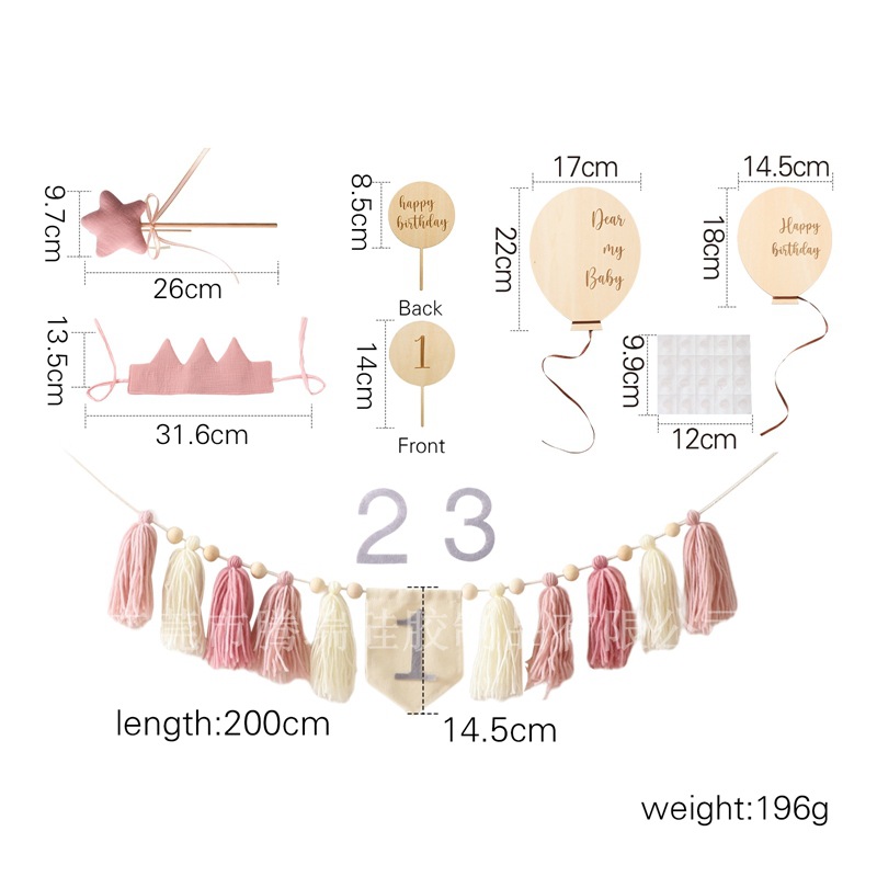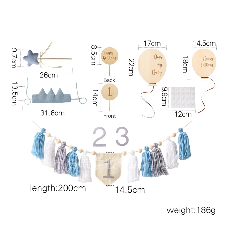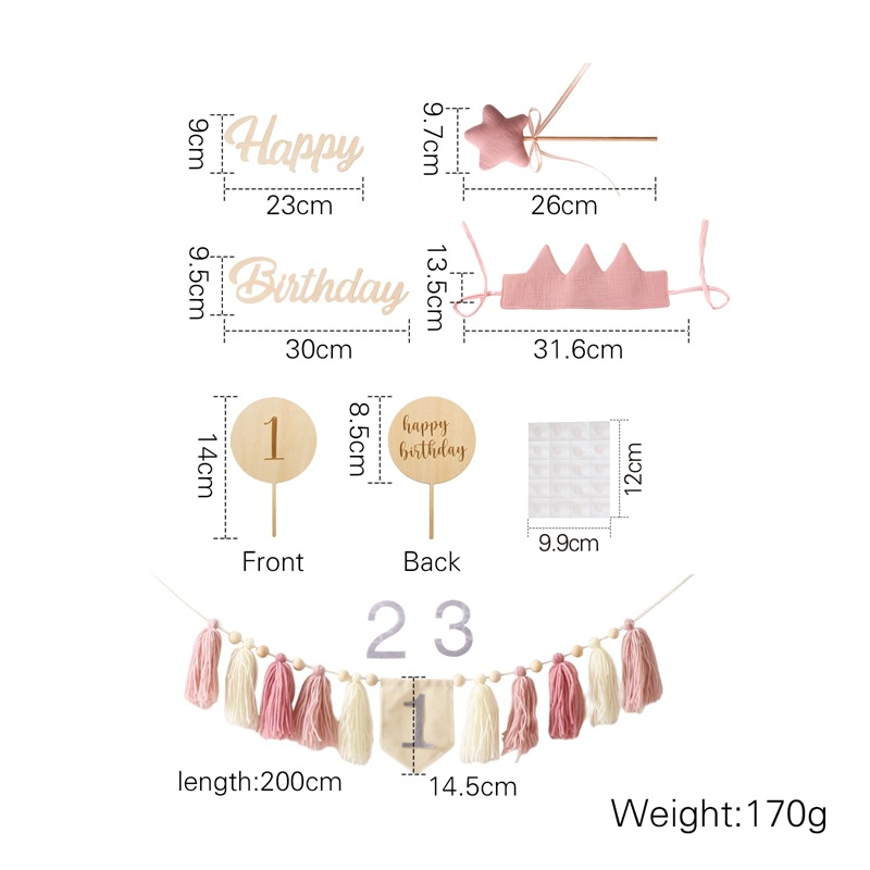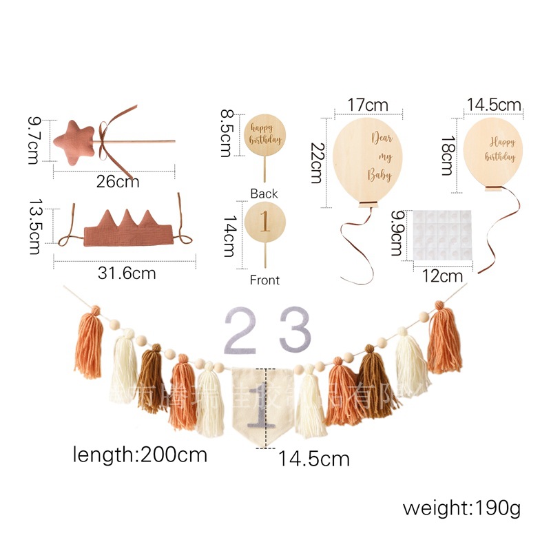 Size: Banner: 200*14.5cm, Birthday Hat: 31.6*13.5cm, Rainbow Stand: 12.7*12.5cm, Balloon Stand: 14*8.5cm