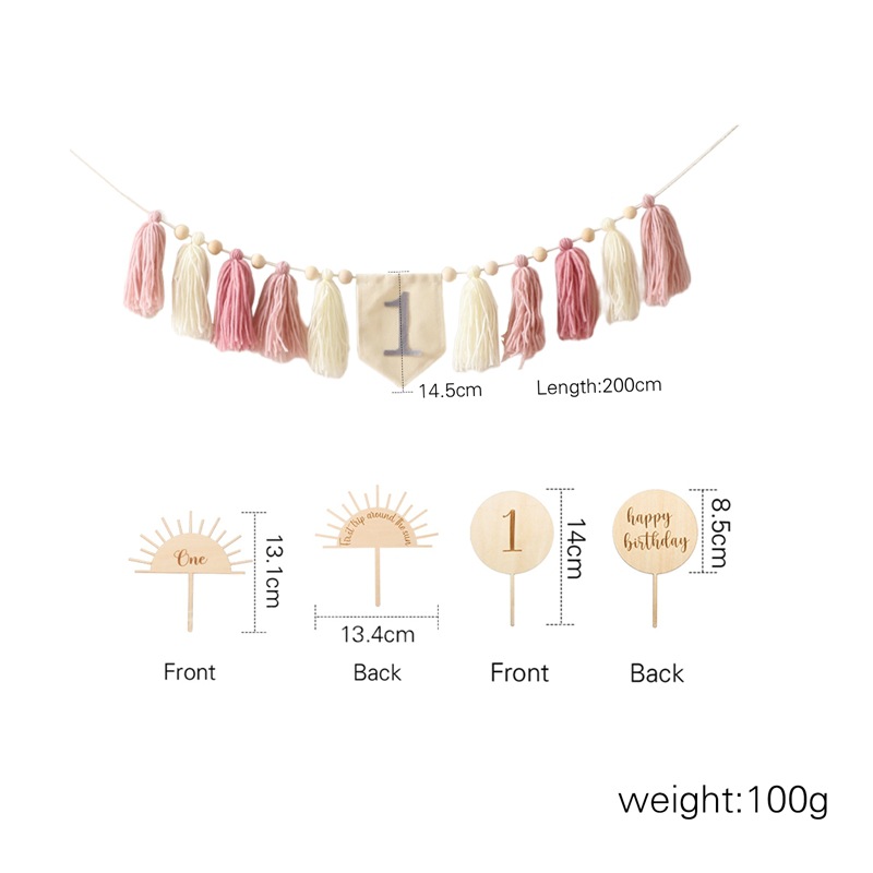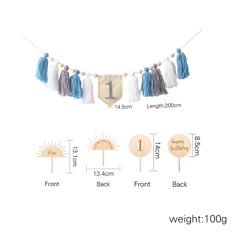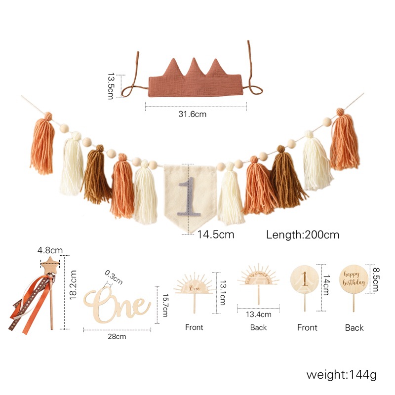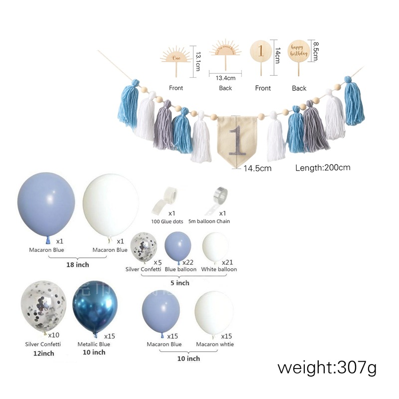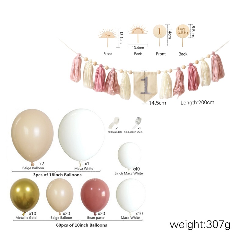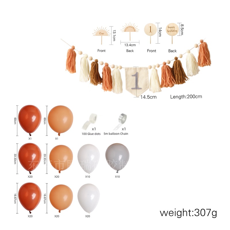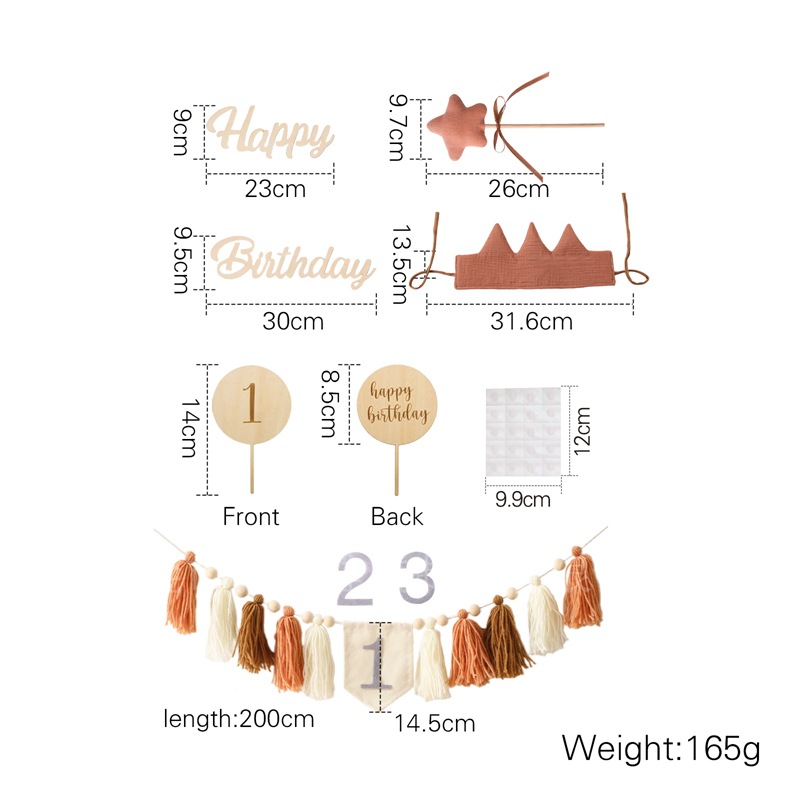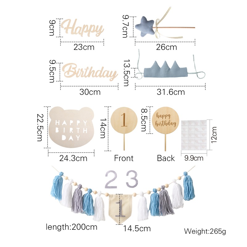 Size: Banner: 200*14.5cm, Birthday Hat: 31.6*13.5cm, Rainbow Stand: 12.7*12.5cm, Balloon Stand: 14*8.5cm