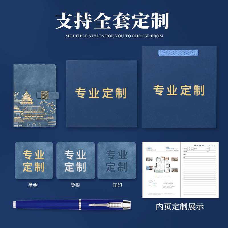 midnight blue-window flower buckle luxury four-piece set [notebook + metal pen + national style bookmark + book holder]]