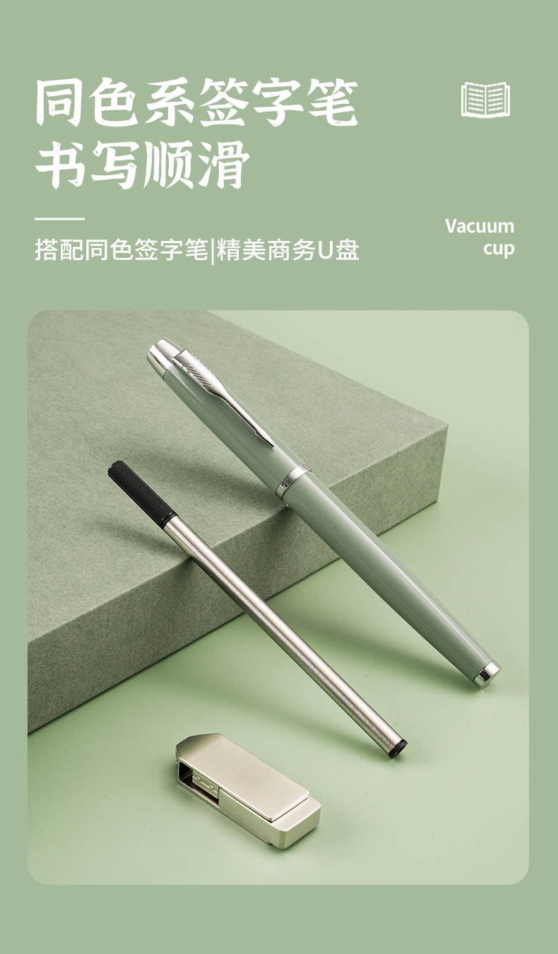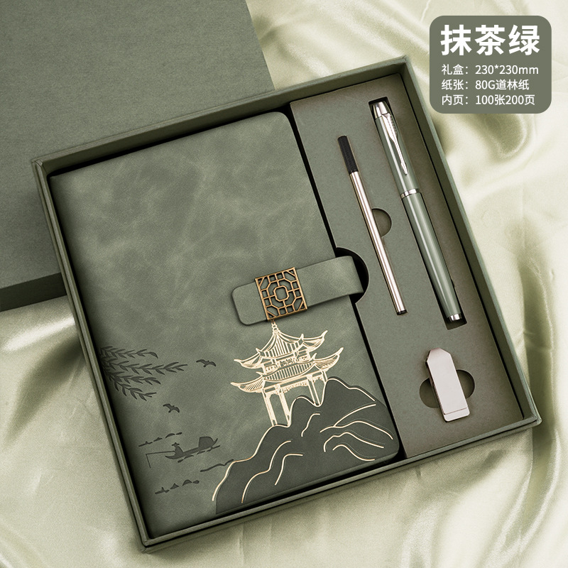 four-piece set of chinese style landscape pane buckle (matcha green notebook + same color pen + refill + u disk + gift box gift bag)