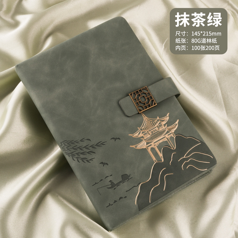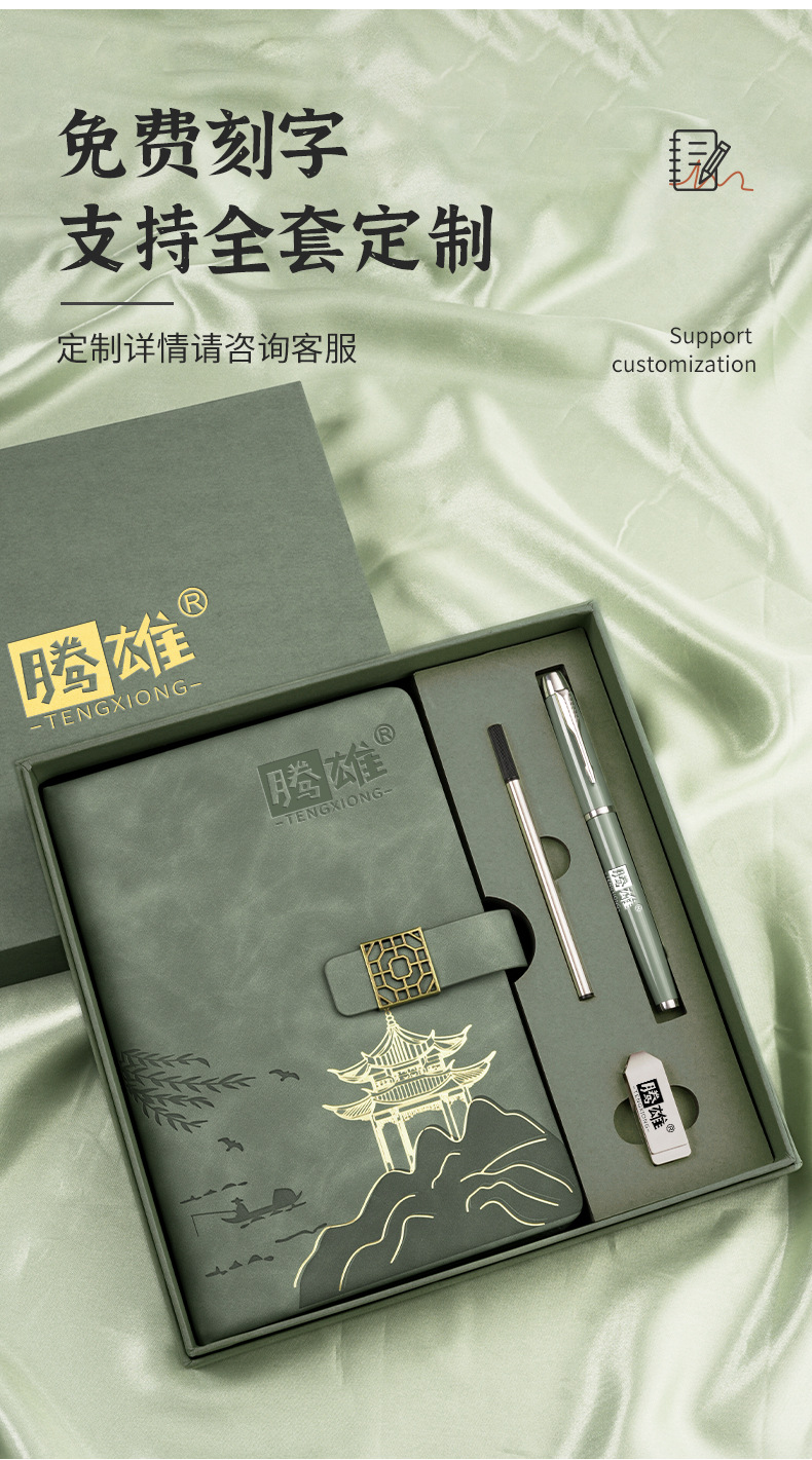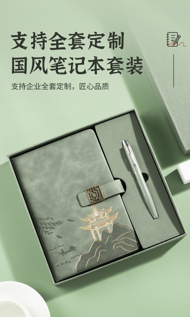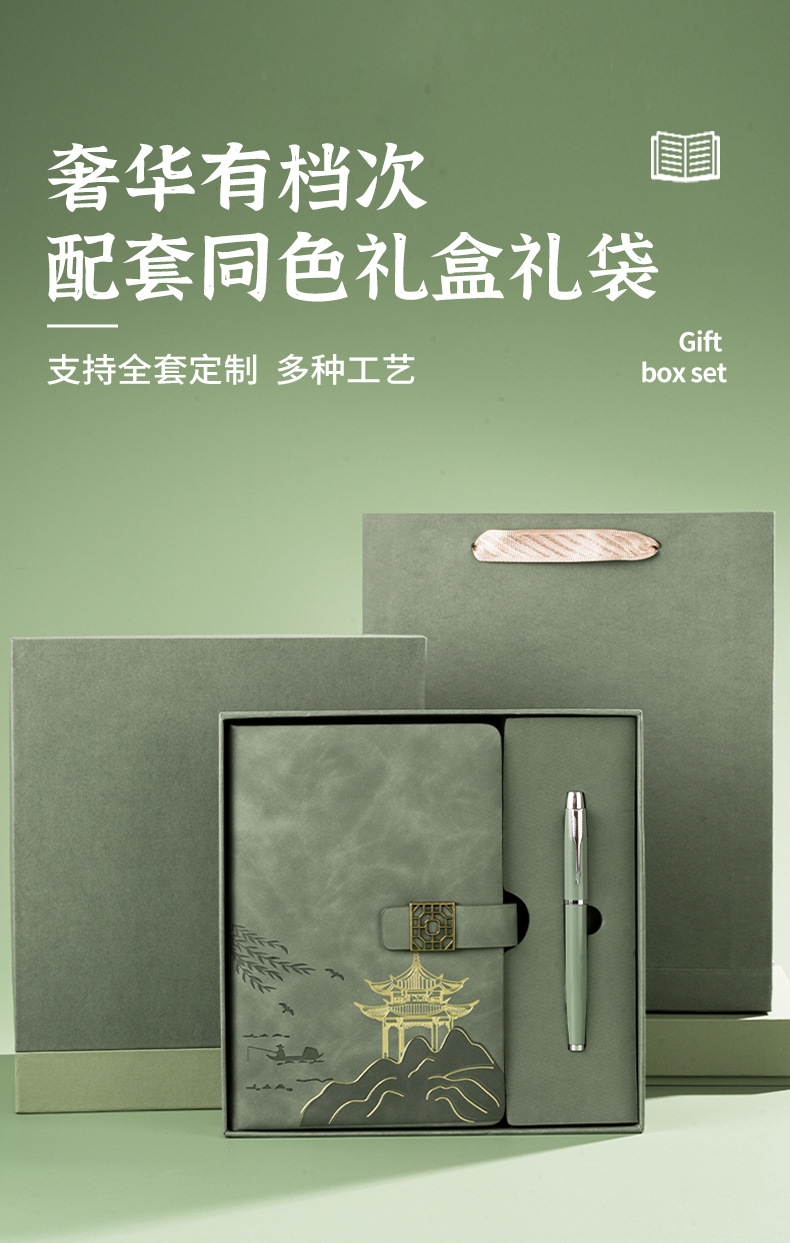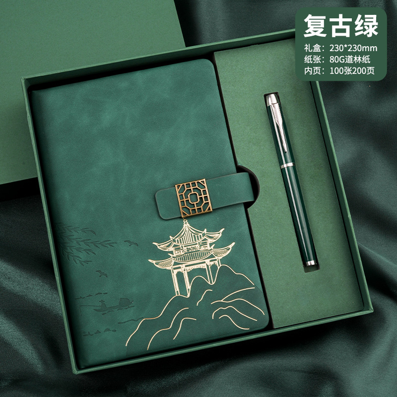 national style landscape pane buckle suit ''(retro green notebook + same color pen + gift box gift bag)
