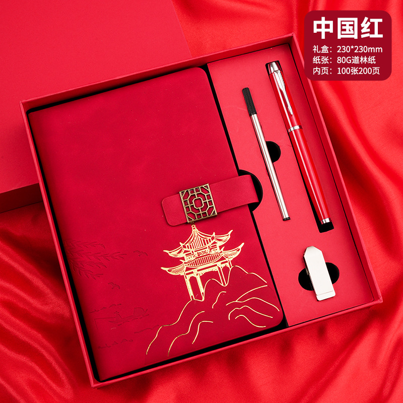 four-piece set of chinese style landscape pane buckle (chinese red notebook + same color pen + refill + u disk + gift box gift bag)