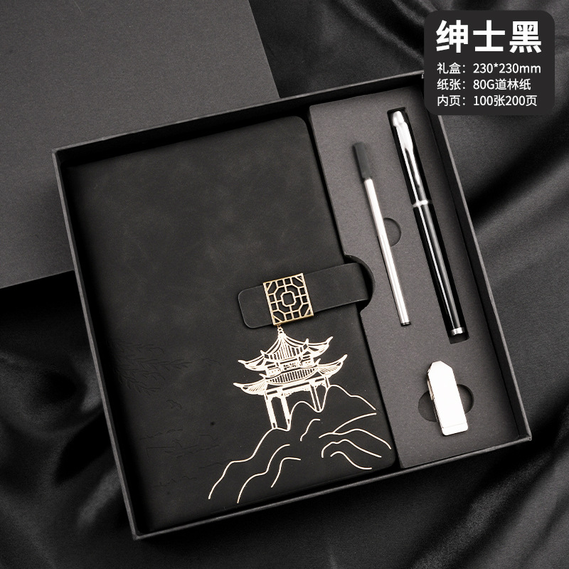 four-piece set of chinese style landscape pane buckle (gentleman's black notebook + same color pen + refill + u disk + gift box gift bag)